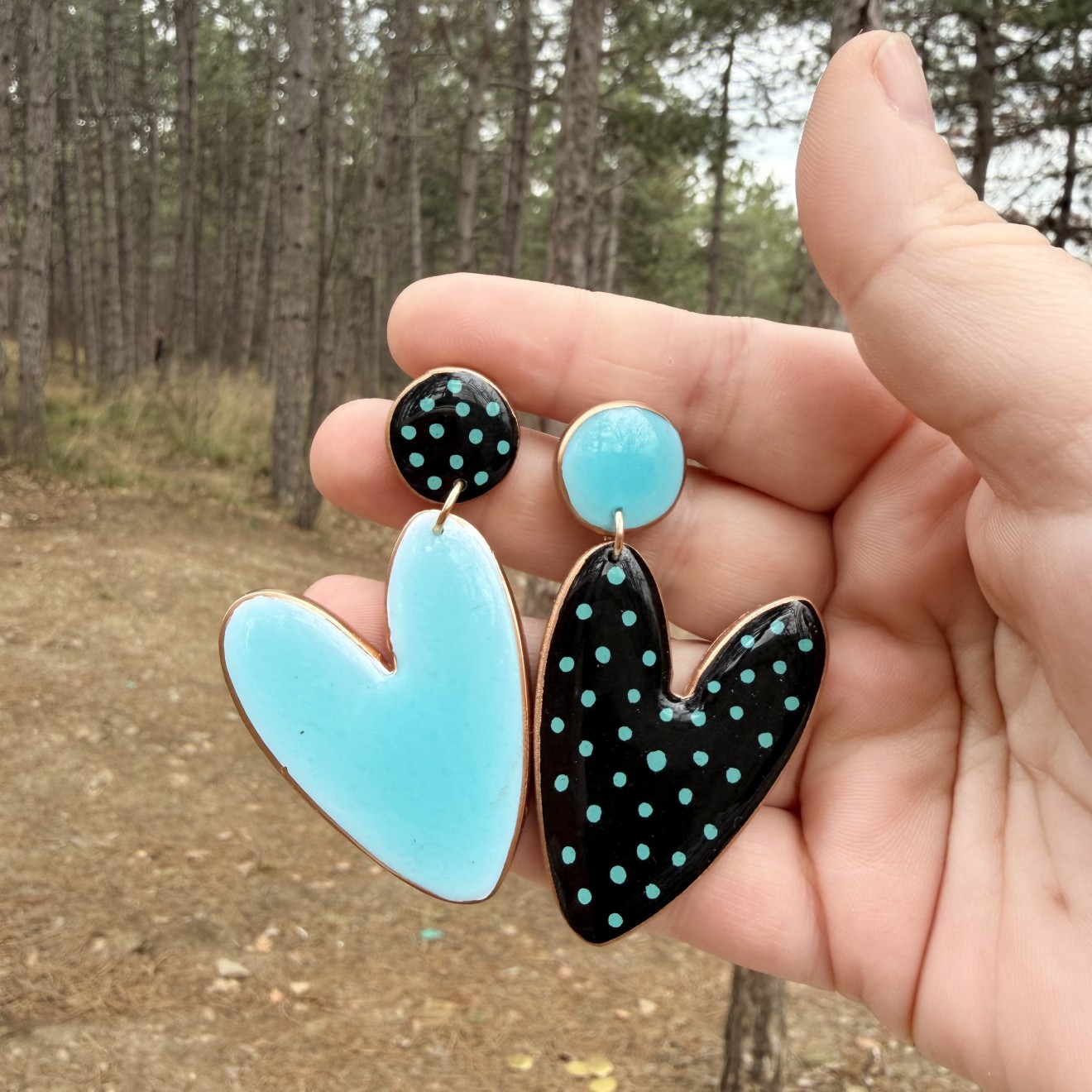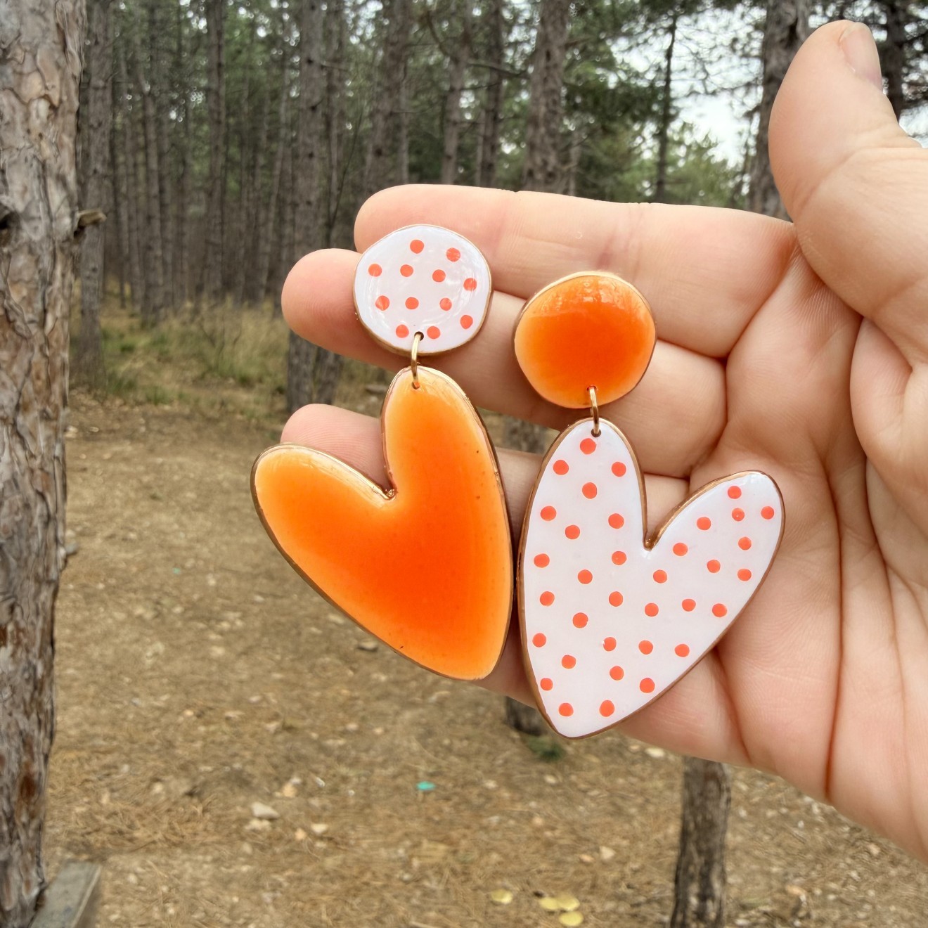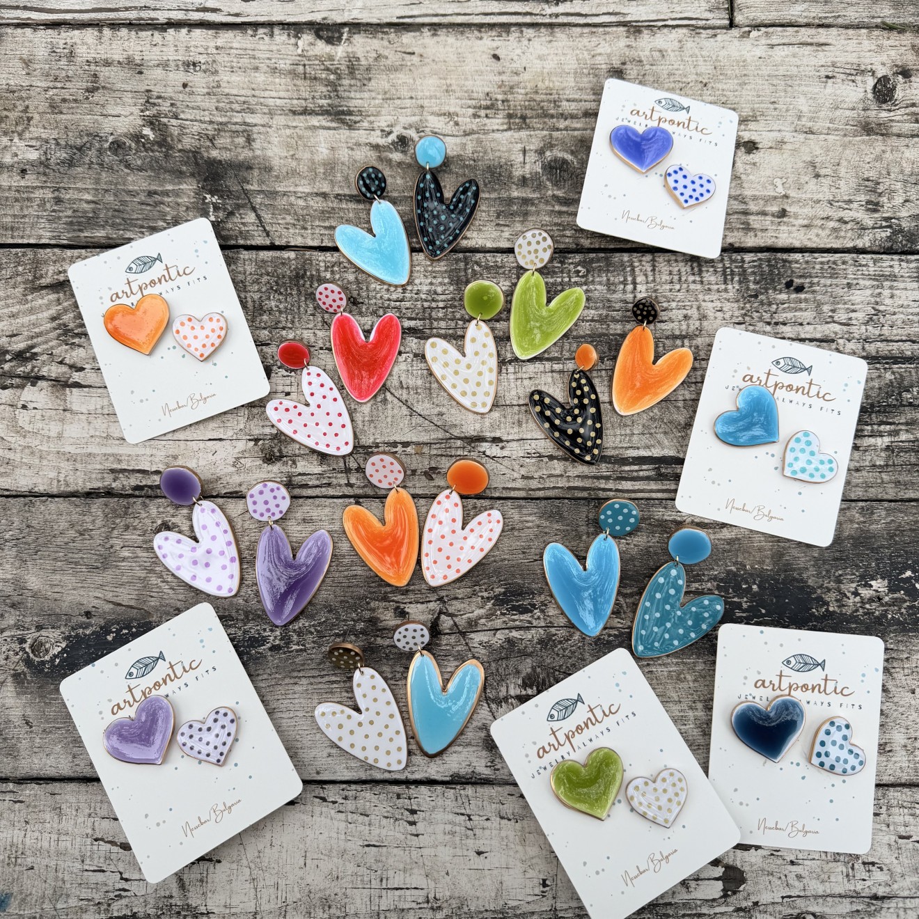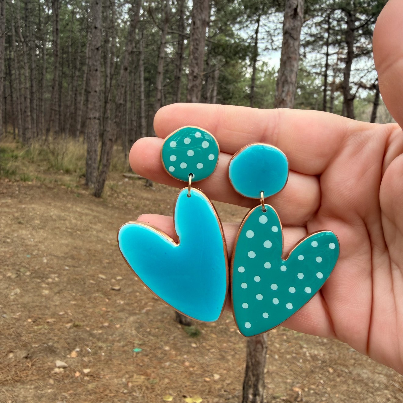 Големи обеци сърца, изработени в различни цветове от глина и оцветена смола с рисувани точки. Изключително впечатляващи на стоманен щифт. За поръчка ще са ми необходими няколко дни, имайте предвид, че може да има леко разминаване в поръчания от вас цвят!