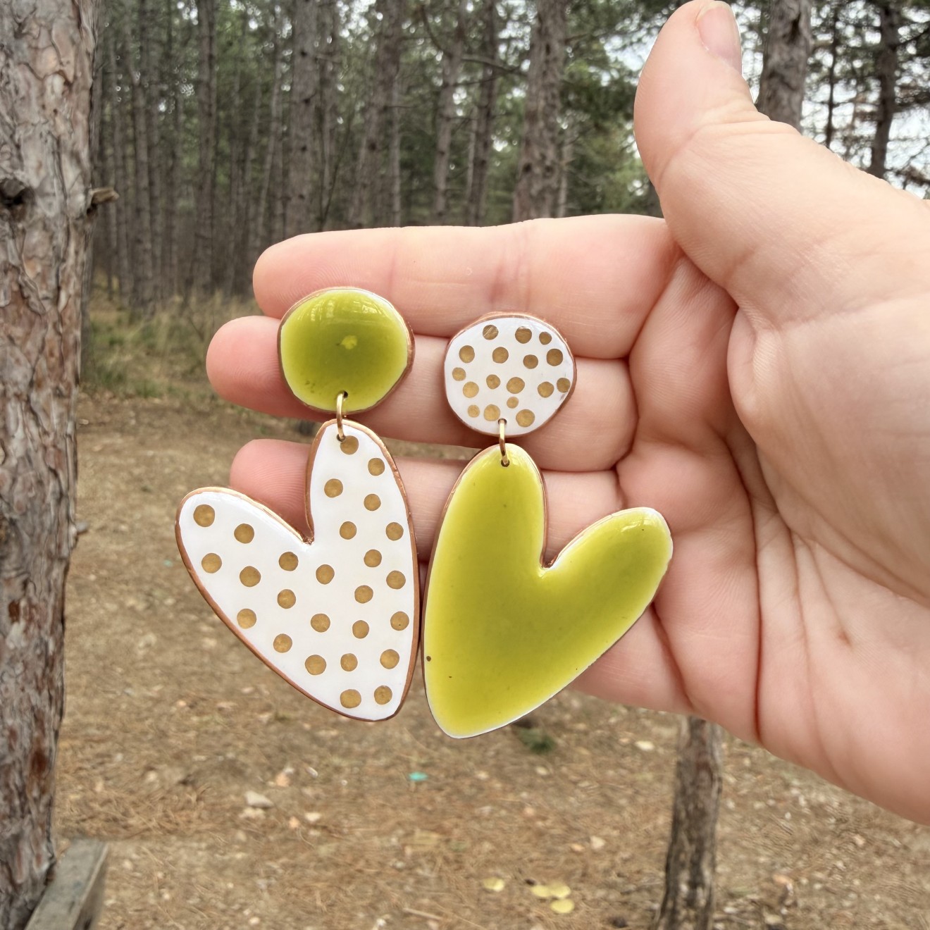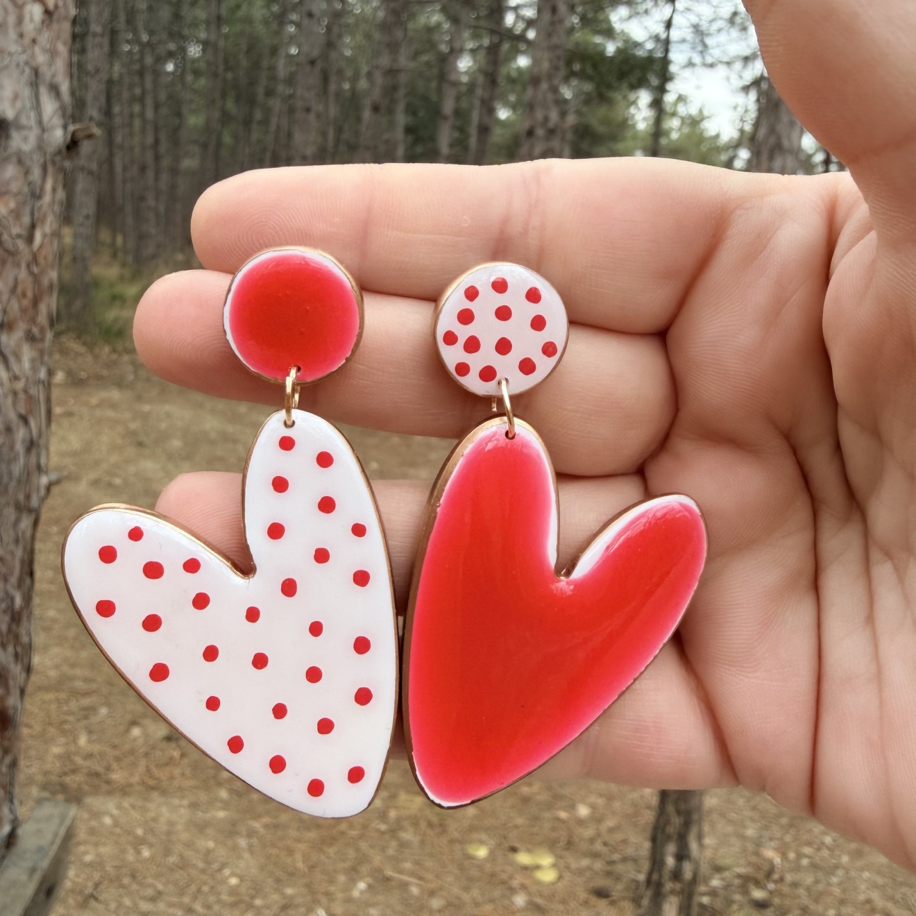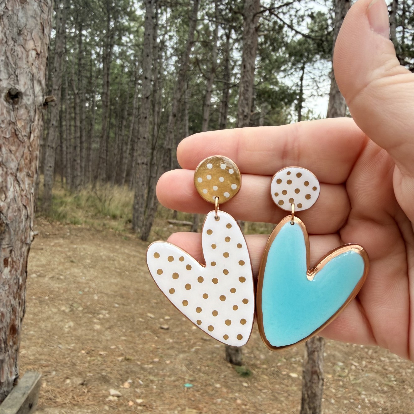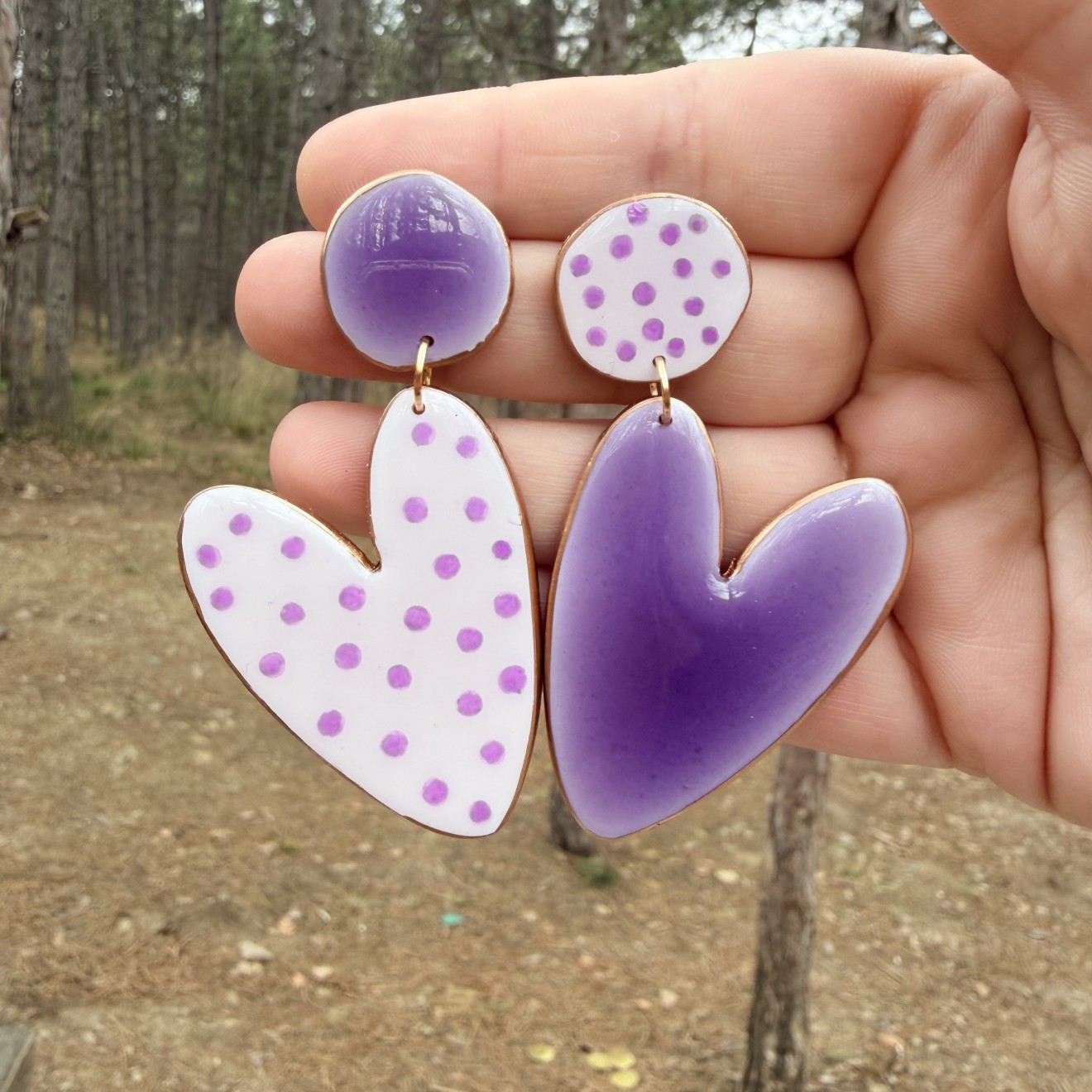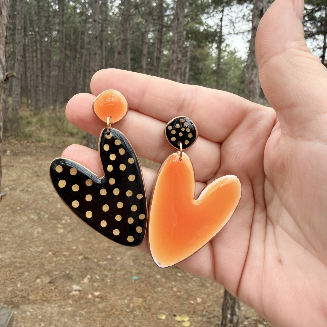 Големи обеци сърца, изработени в различни цветове от глина и оцветена смола с рисувани точки. Изключително впечатляващи на стоманен щифт. За поръчка ще са ми необходими няколко дни, имайте предвид, че може да има леко разминаване в поръчания от вас цвят!