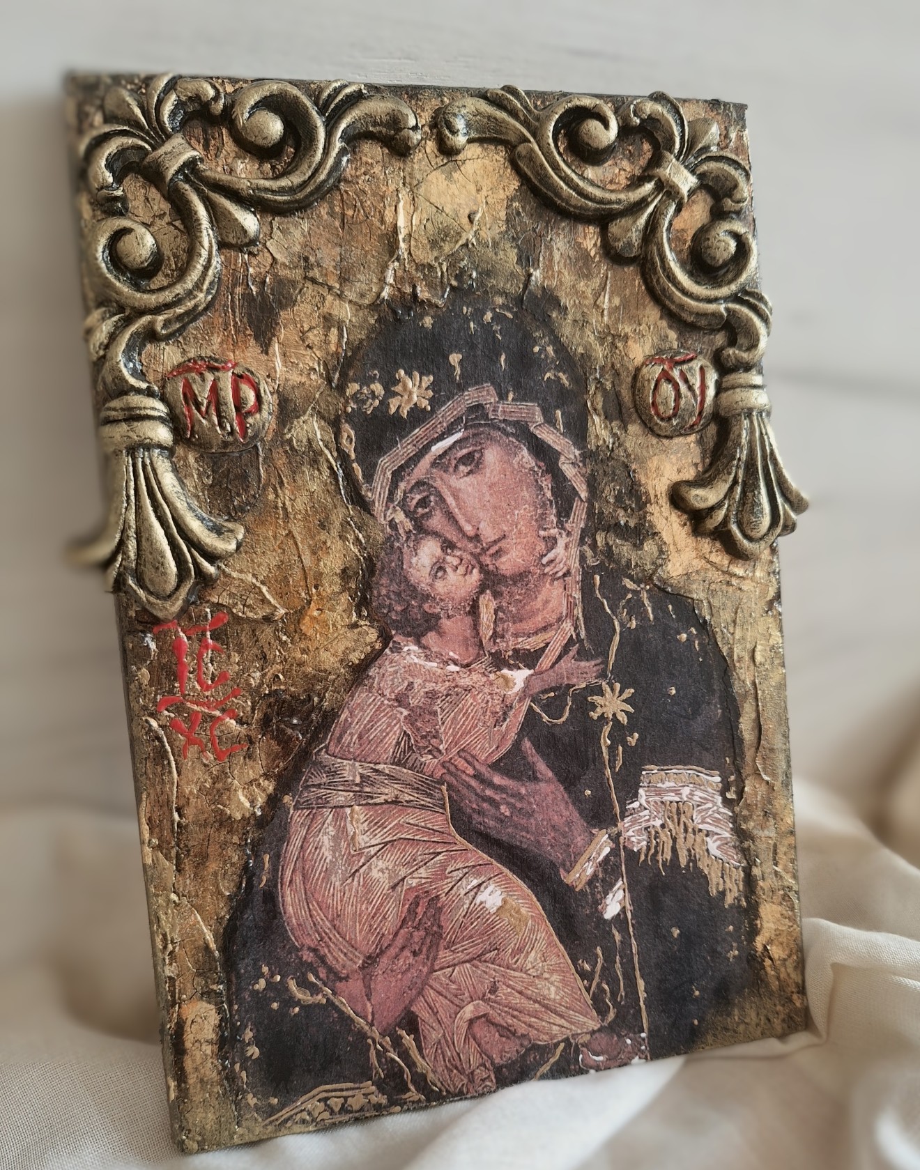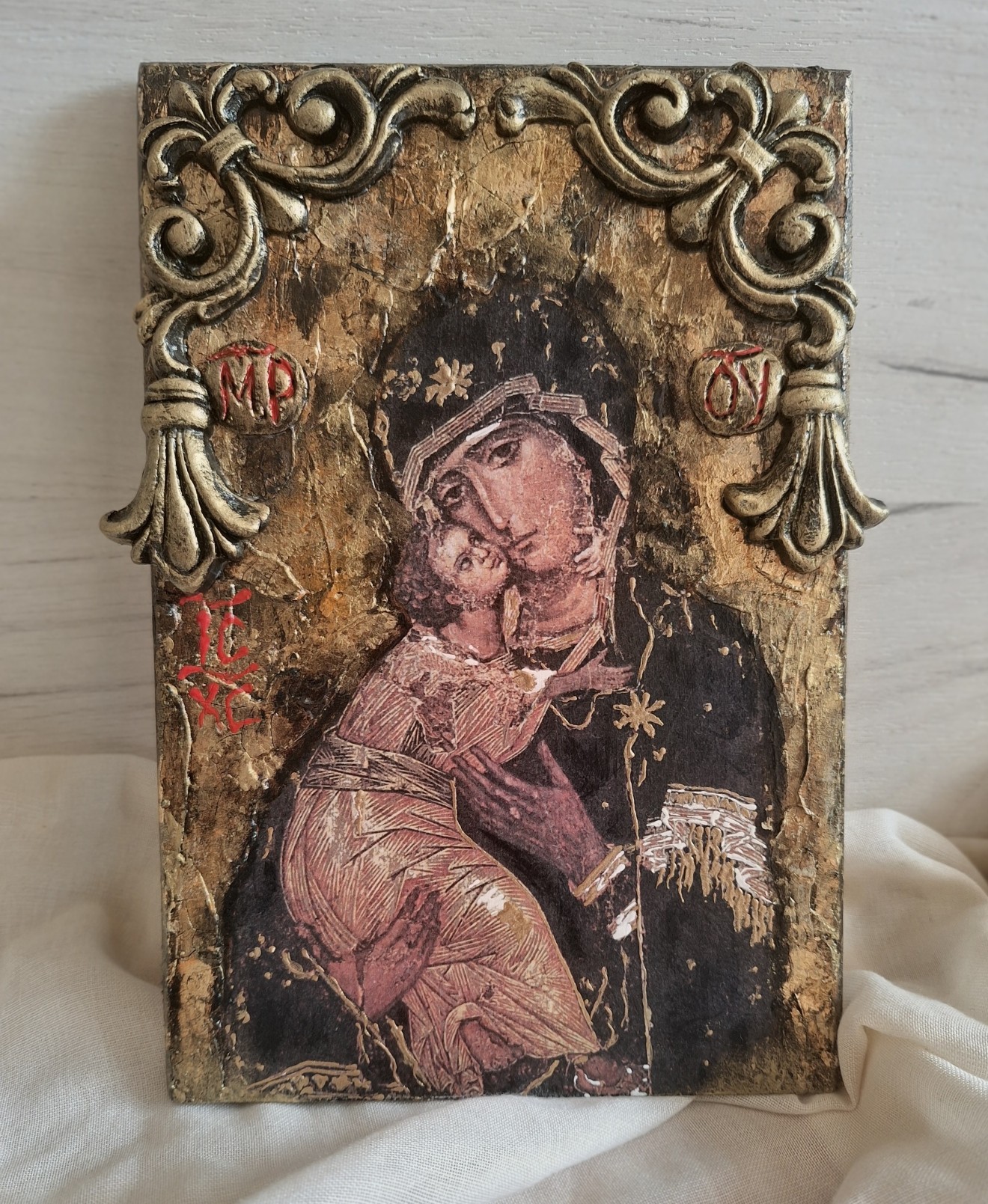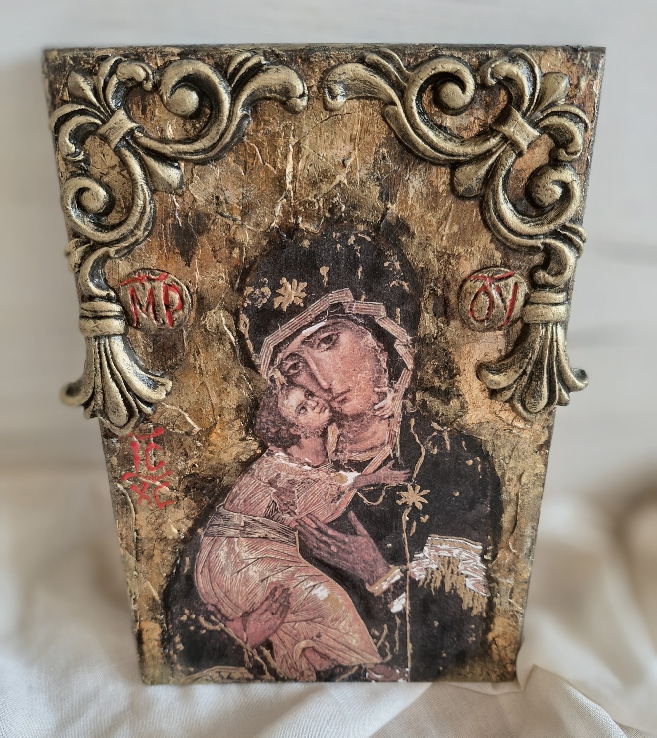 Ръчно направена икона на Св. Богородица с Младенеца. Използвани материали: Оснона-дърво Моделираща паста Кракле Вакси Панина Обемни елементи Златен варак