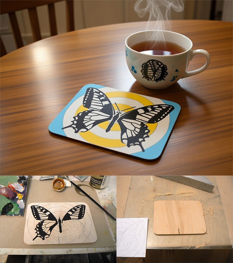 Изработвам по поръчка такива подложки за чаши. Рисувам ги на ръка с молив, четка и боя. Правя ги от дърво. Него също го обработвам ръчно. Размери 10 на 13 см. Цената е за една бройка. Нужното време за изработка е около ден, но трябват повече дни защото боята и крайния лак съхнат бавно.