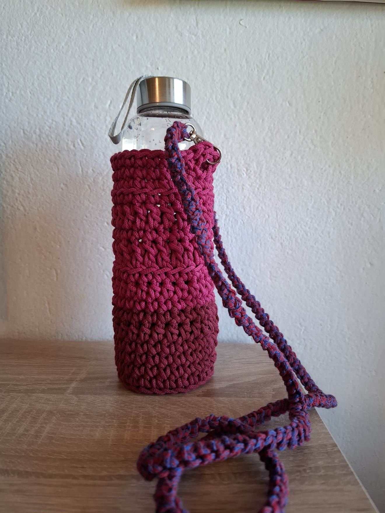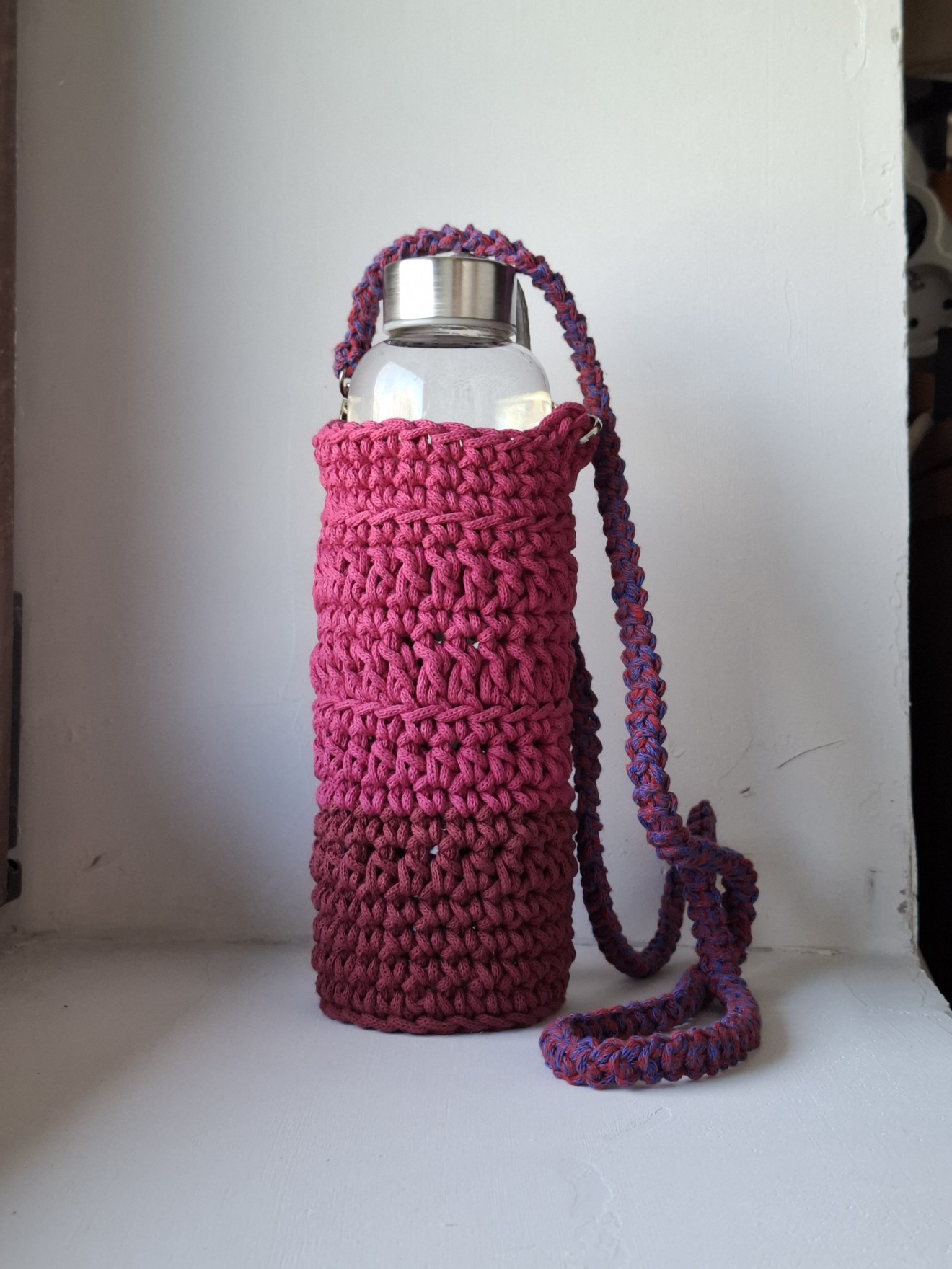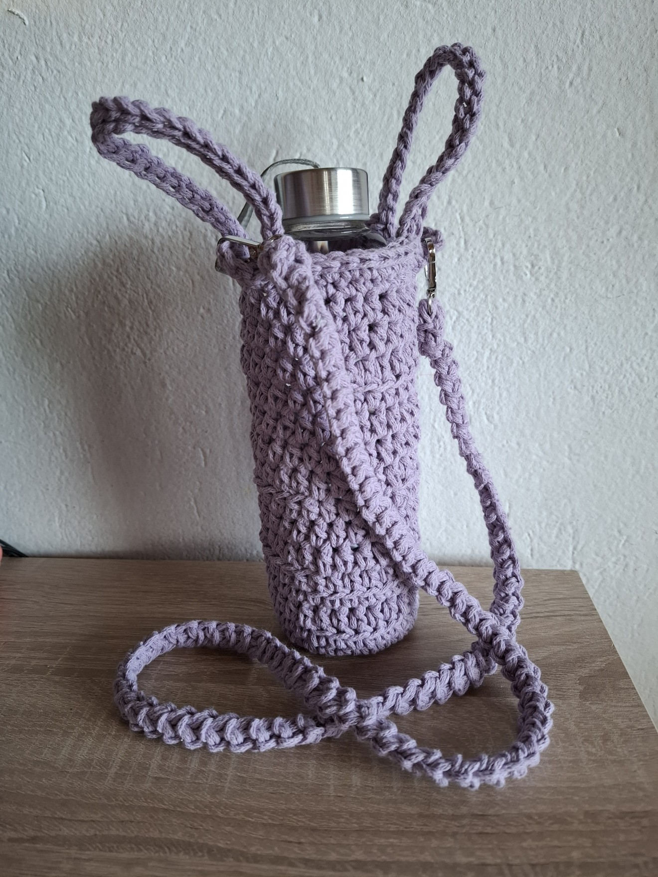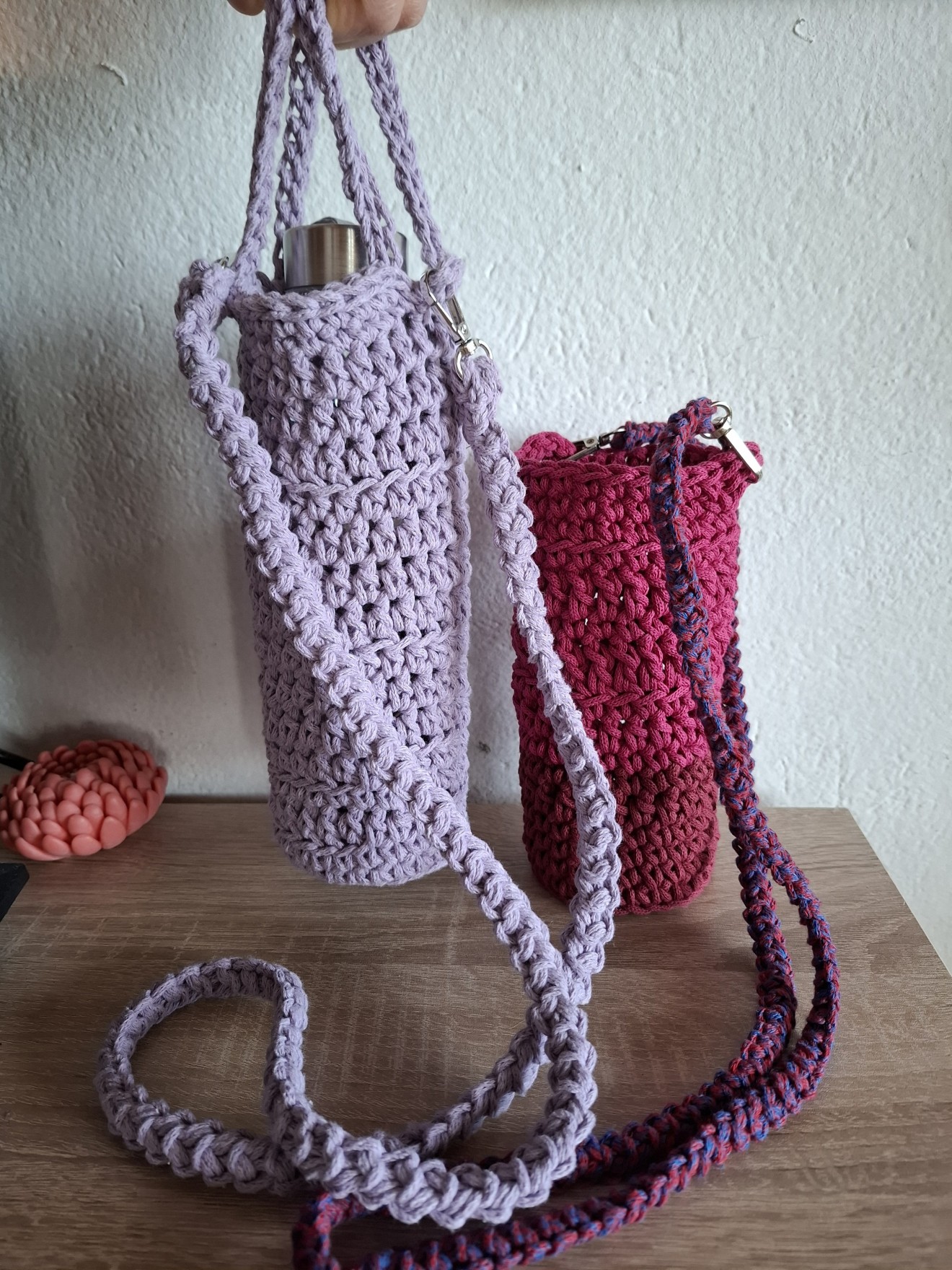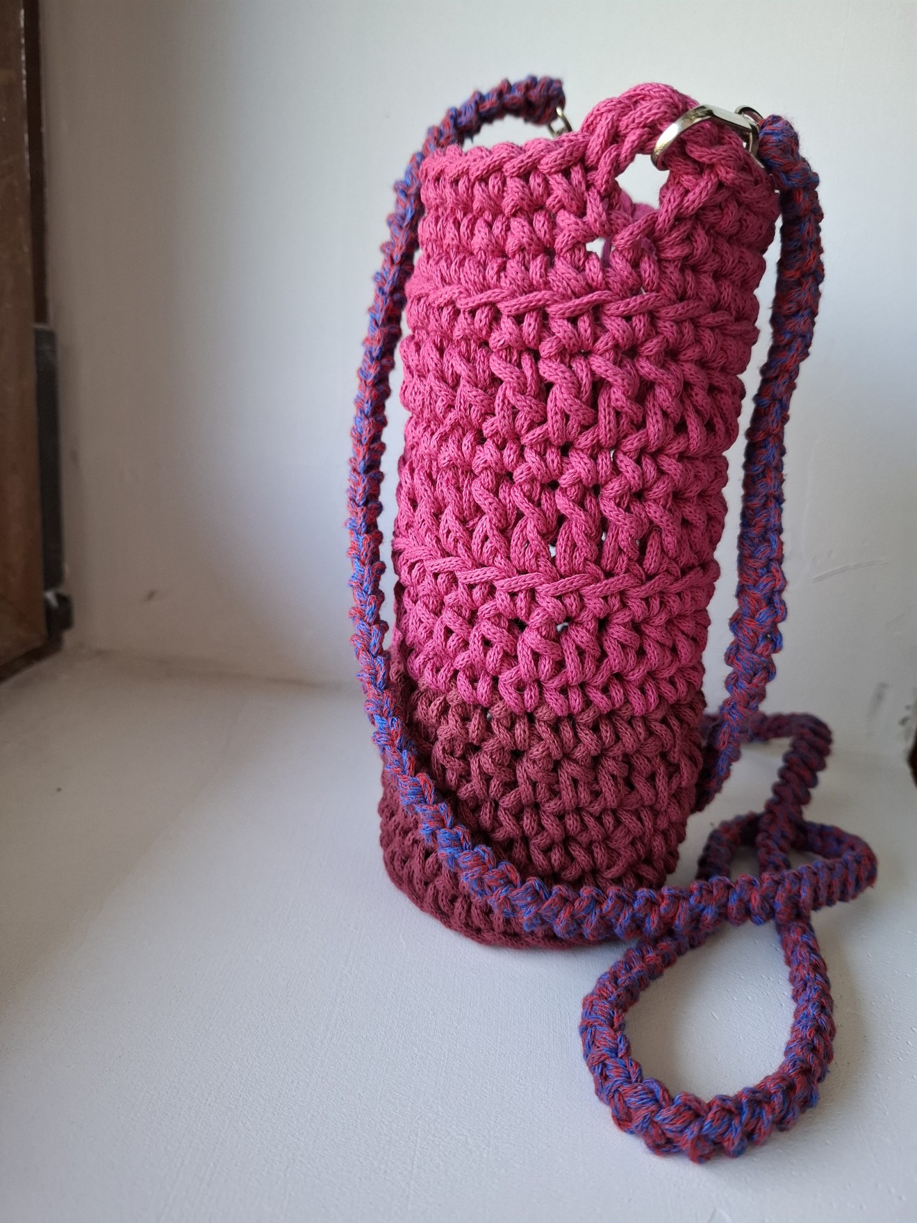 Чанта за бутилка с дръжки. (Плетен калъф за бутилка). Изплетена от тънко въже, памучно или смес от 80% памук и 20% полиестер. Изработва се в три варианта: - с дълга плетена дръжка за носене на рамо/през тялото; - с къси дръжки за носене в ръка; - едновременно с къси дръжки за носене в ръка и дълга дръжка, която се сваля. Тази от снимките в розово е подходяща за бутилка с диаметър около 6 см. и височина 25 см., за стъклена бутилка от 500 мл. Дръжката е плетена и се сваля. Светло лилавата е подходяща за бутилка с дъно диаметър 7-8 см., височина на калъфа 20 см. Бутилката не се предлага. Чантата може да се пере в пералня. Напишете съобщение, за да уточним детайлите. Изработват се и с размери по желание на получателя. Поздрави! Пълноцветни дарове