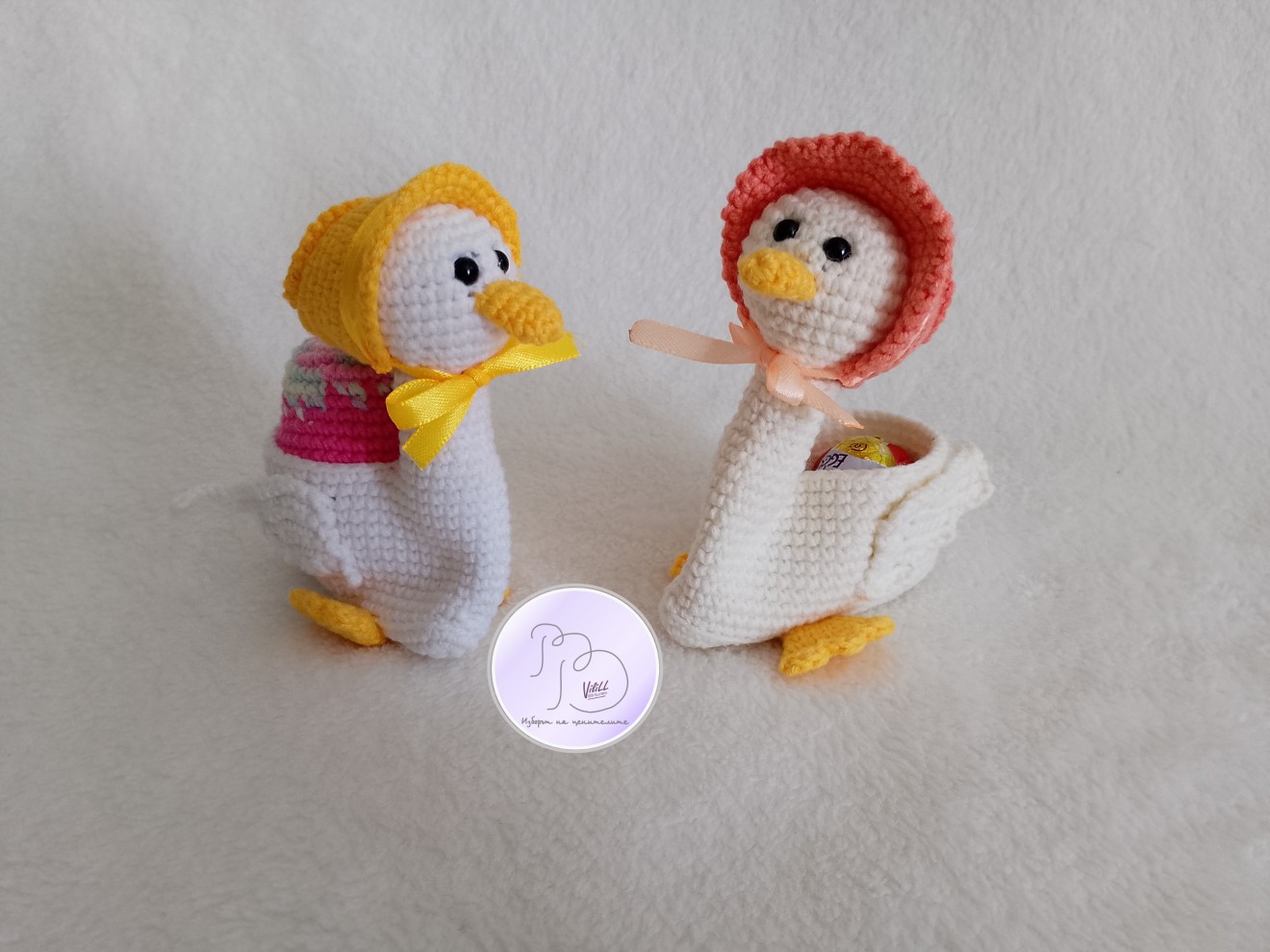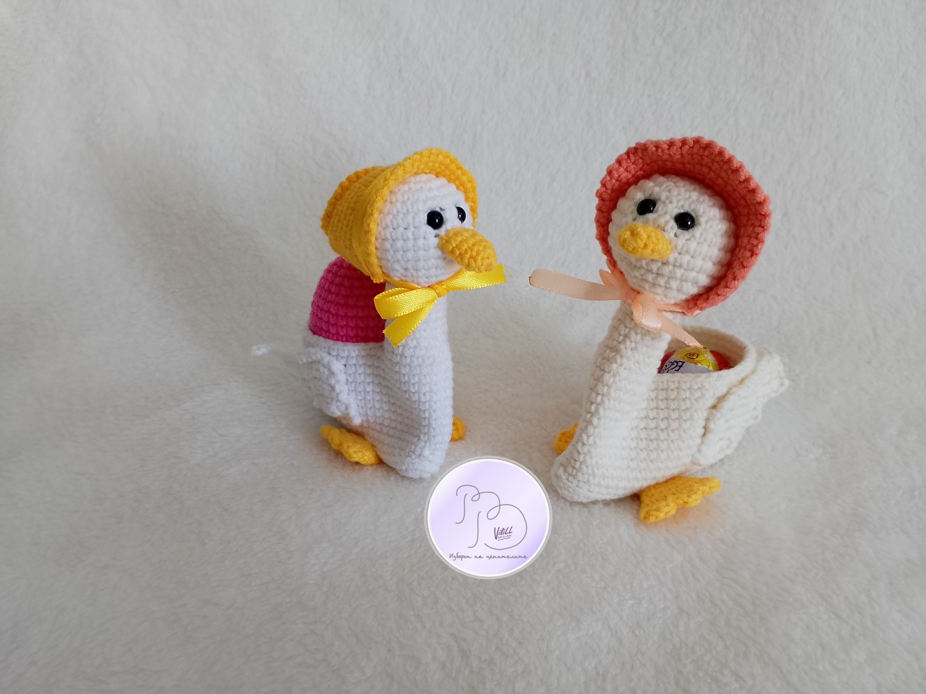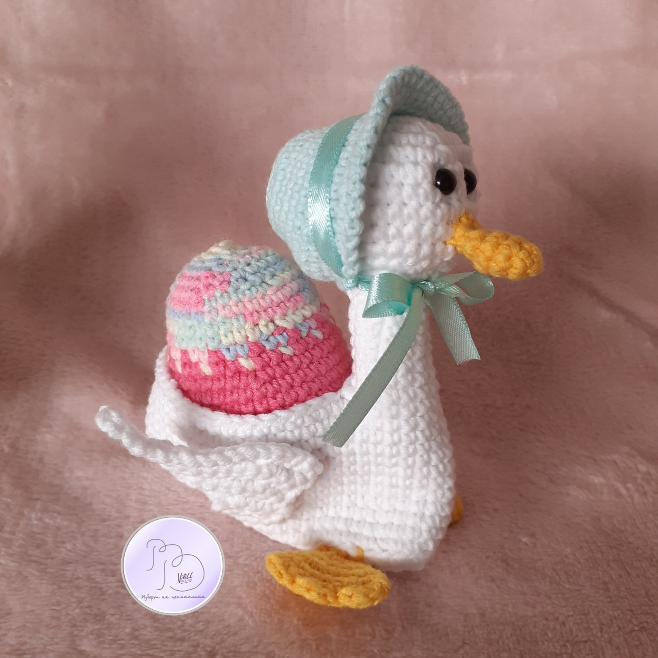 Великден с усмивка… И малко вълшебство. Не масово. Не безлично, а истинска емоция. Чаровните патици, които носят усещане за уют, грижа и онова детско вълнение, което прави празниците истински специални. А най-сладката част? Освен, че са очарователна украса, в тях има и място да се скрие малка изненада. - Създадени да усмихват. -Перфектна идея за подарък на дете или любим човек. - Красив акцент за празничната декорация. -Малък жест, който остава спомен. Приблизителни размери: -дължина- около 9 см. -височина-10см, с шапката- около 11-12см. Материал: -прежда- смес от акрил и памук. -силиконов пълнеж. -безопасни пластмасови очички на винтче. -сатенена панделка. Цена: 1).13 евро/25.43лв. и се отнася за наличната патица+яйце (шапката и яйцето може да се изработят и в друг цвят). 2).по отделно: -11.00евро/21.51лв. патица. -3.00евро/5.87лв.-яйце. Доставка до офис на Еконт за сметка на получател.