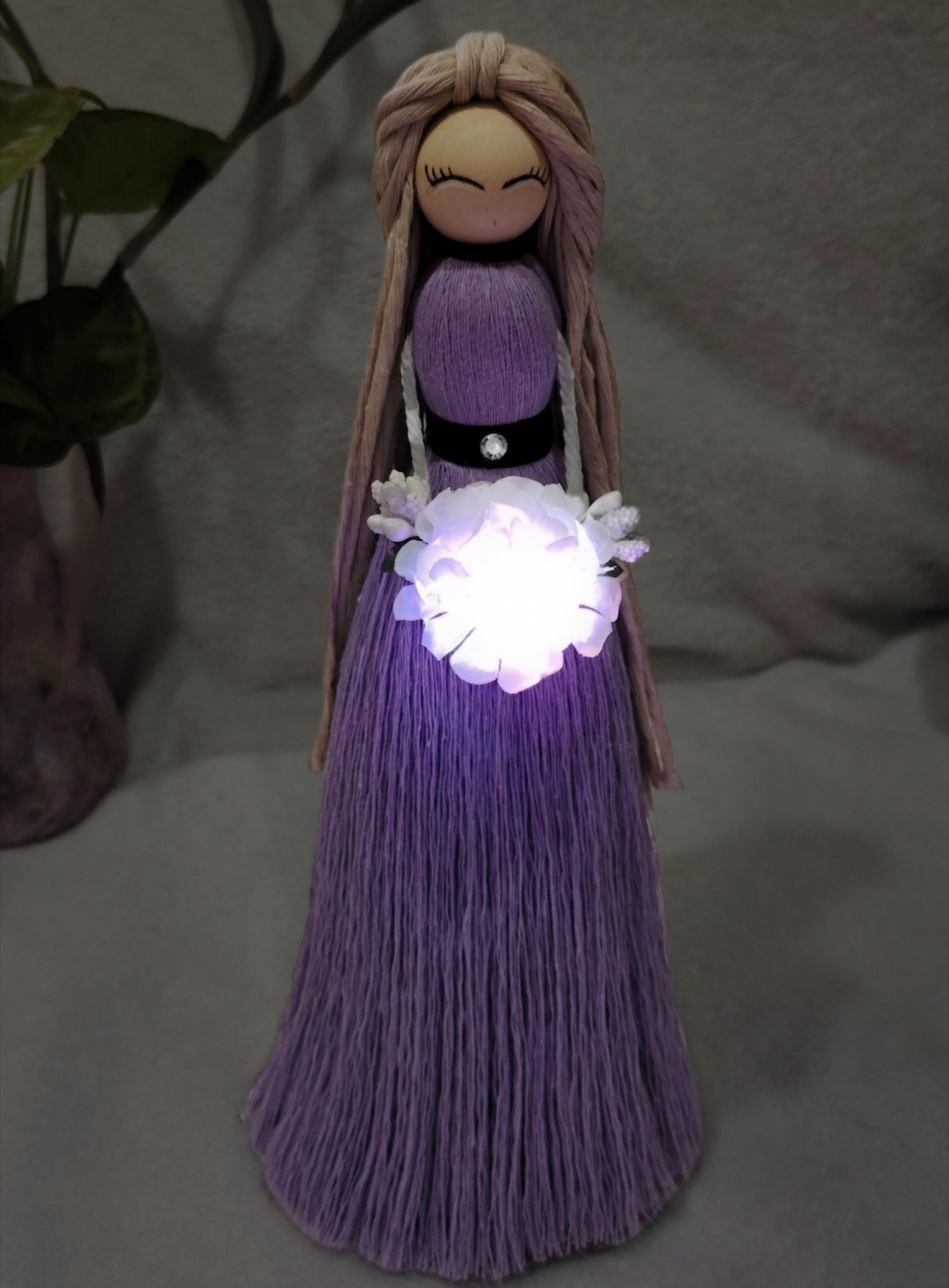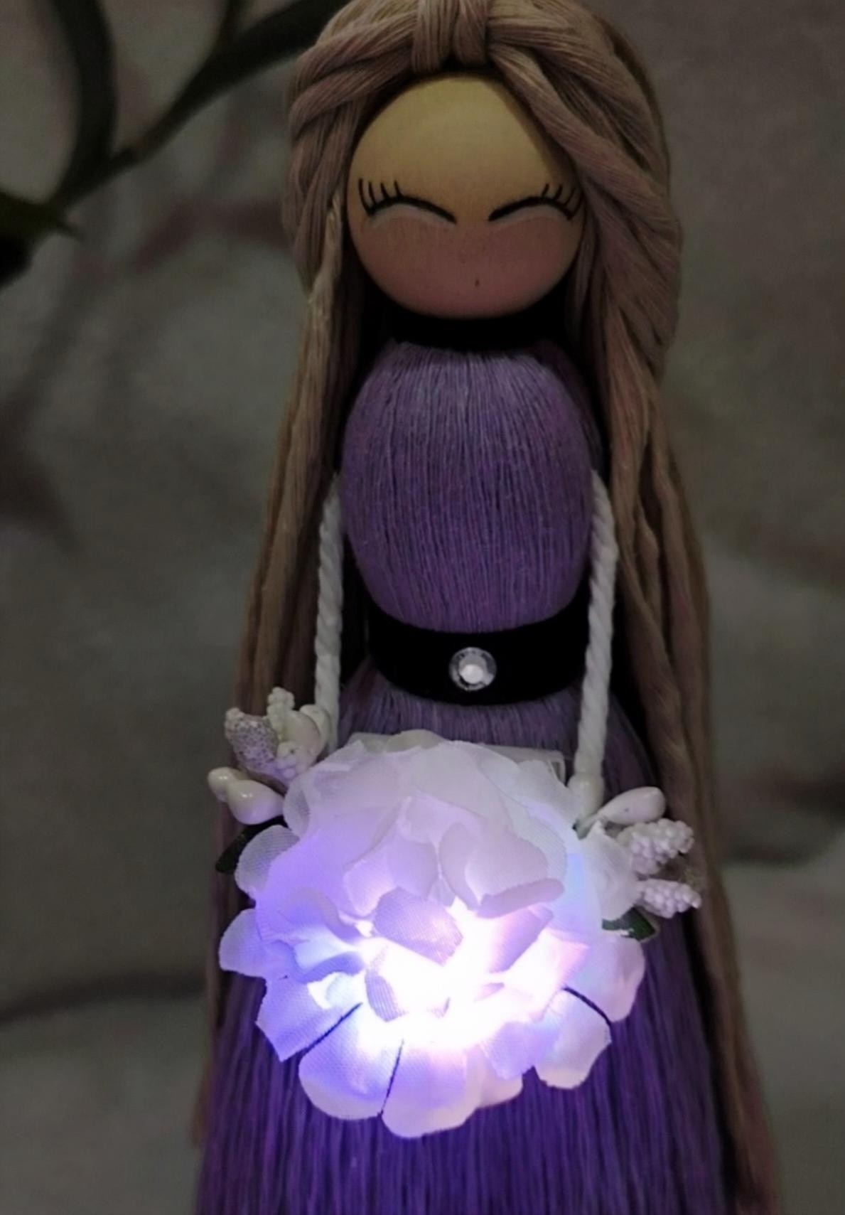 💜 Лилава нежност 💜 Има подаръци, които просто се подаряват… и има такива, които остават спомен. 💜✨ Тази ръчно изработена кукла носи нежност, светлина и усещане за уют. Облечена в мек лилав цвят — символ на спокойствие, женственост и мечти — тя държи красиво цвете, което свети като малка магия в ръцете ѝ. 🌸 Подходяща е за специален подарък, за украса на дом, за любим човек или просто за момент, в който искате да подарите емоция. Всяка кукла е изработена с внимание към всеки детайл и носи собствен характер и настроение. 🤍 Ако търсите нещо различно, лично и създадено със сърце — тази малка дама е точно такъв избор. ✨ Размер - 28см /куклата стои самостоятелно / Цена - 19.50€ Три режима на светлина - два мигащи и един постоянен.
