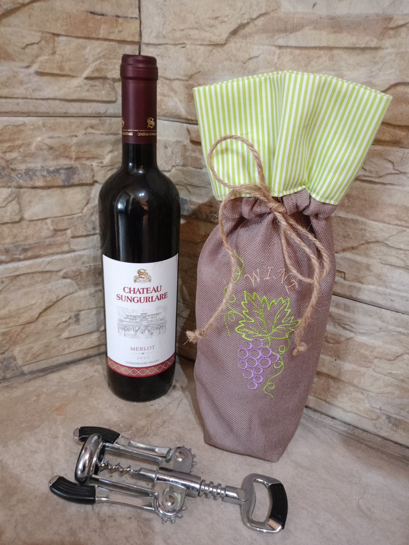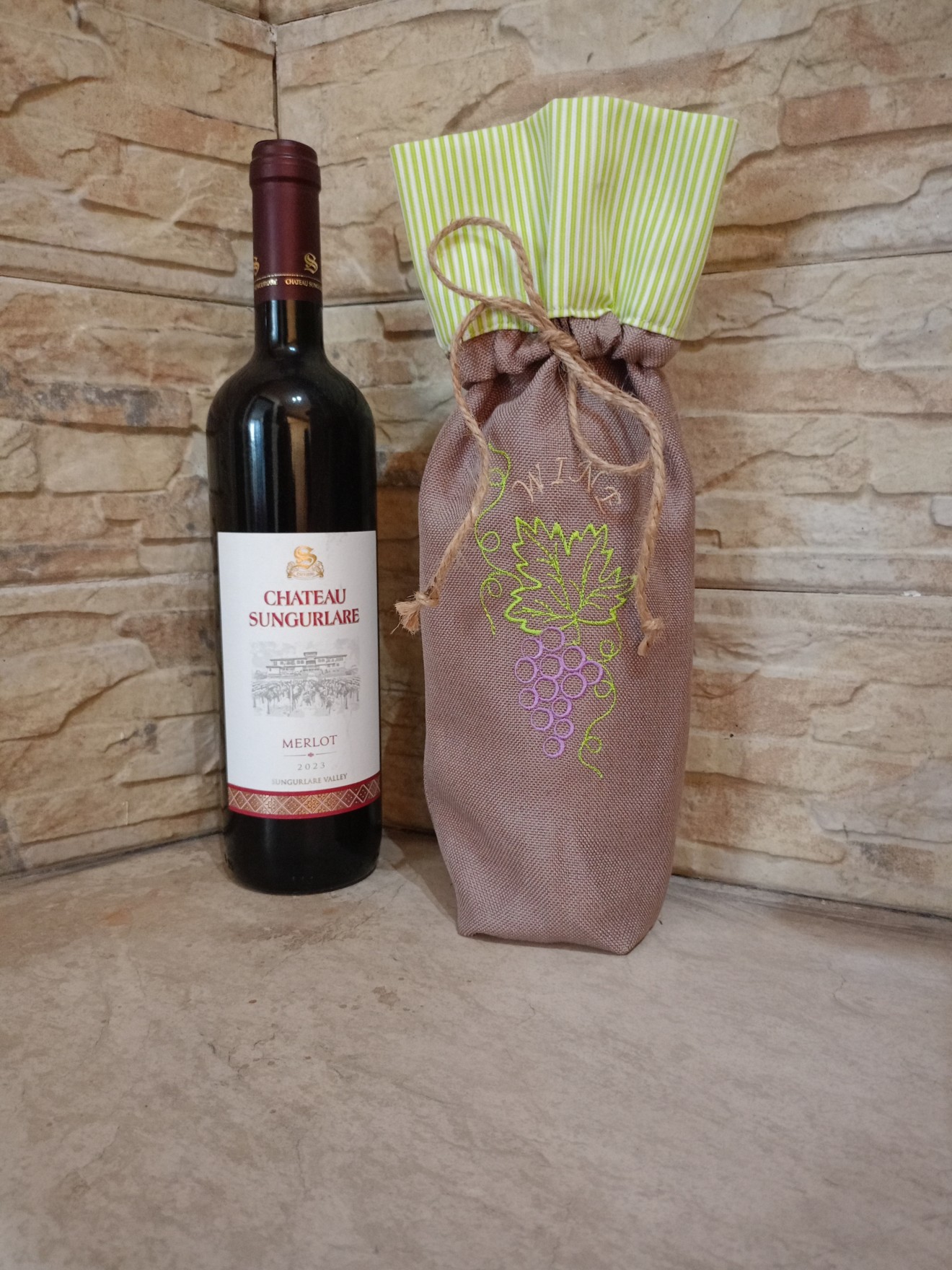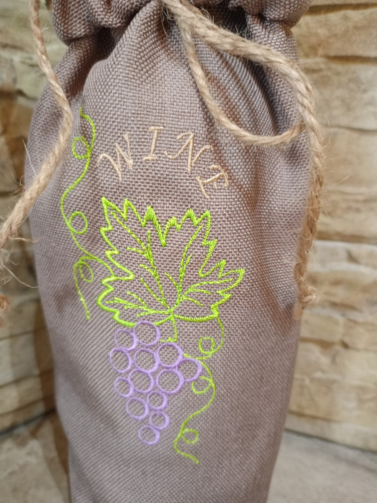 Текстилен калъф за бутилка вино с бродерия е стилен и практичен аксесоар, който придава завършен и елегантен вид на всяка бутилка. Изработен от висококачествен текстил, калъфът съчетава здравина и мекота, като предпазва бутилката от надраскване и същевременно я представя по изискан начин. Калъфът е лесен за поставяне и сваляне, често снабден с връзка или панделка за удобно затваряне. Подходящ е за подарък, допълнение към празнична декорация или стилен начин за поднасяне на вино при различни събития. Съчетавайки функционалност и естетика, текстилният калъф за бутилка вино с бродерия е отличен избор за всеки, който държи на детайла и красивото представяне.