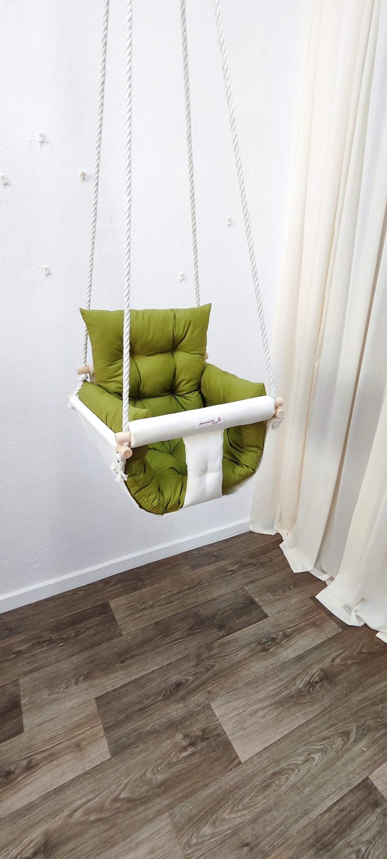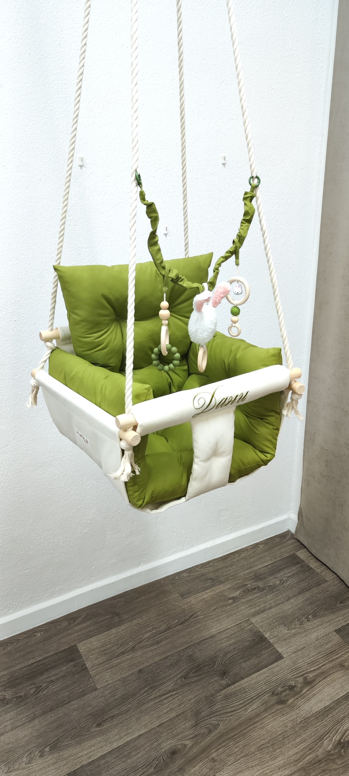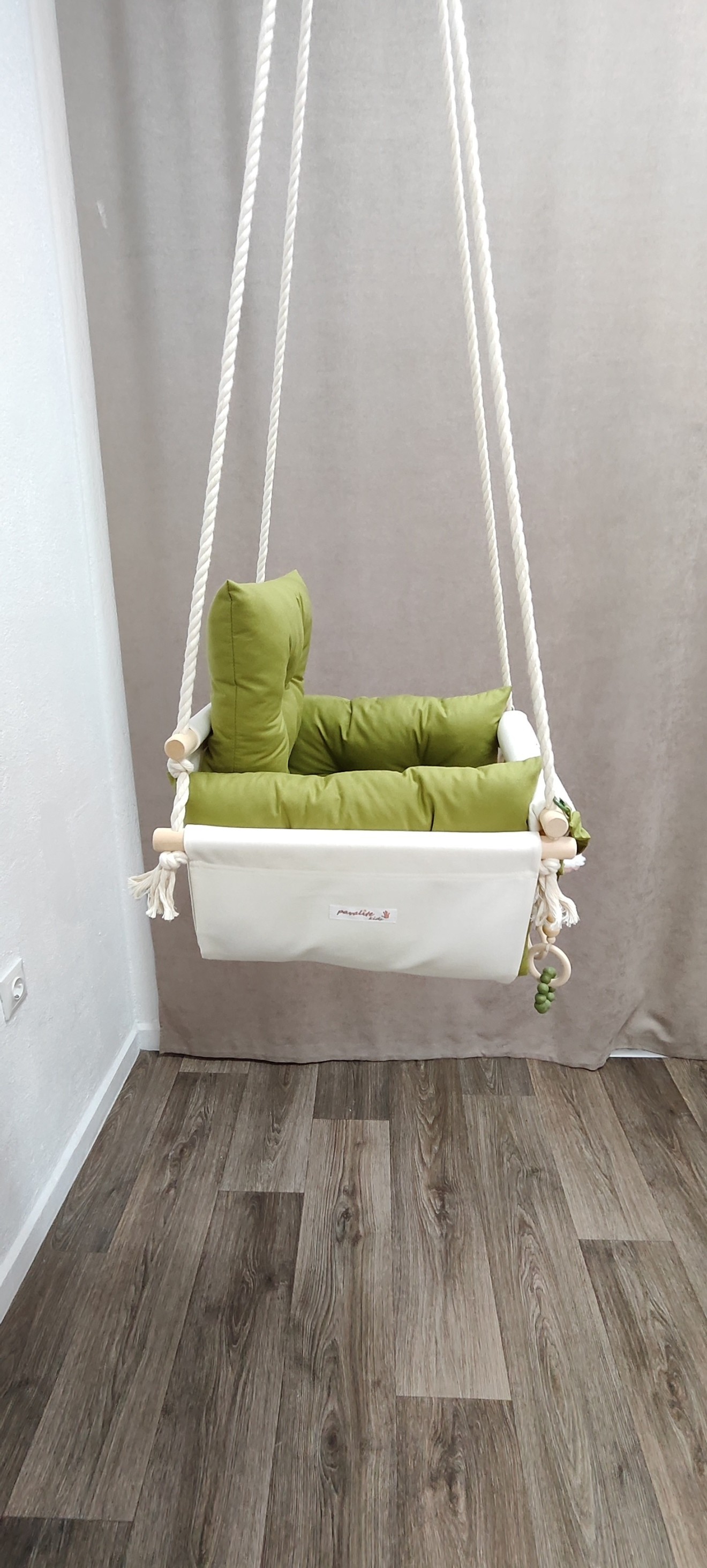 Луксозна бебешка люлка Няма нищо по-хубаво от детския смях, който оглася дома. Сега той може да бъде още по-сладък с нашите ръчно изработени текстилни люлки! - Уют и комфорт: Меки възглавнички и нежни материали. - Забавление: Добаветеиграчки за развиване на фината моторика - Персонализация: Можем да добавим името на вашето дете, за да бъде подаръкът наистина уникален. Направете детството незабравимо. * Цена на люлката - 51 евро * Комплект от 3 броя играчки за закачане - 10 евро * Бродерия на име - 6 евро * Дървени топчета на предните въжета - 4 евро * Предпазен колан - 3.50 евро Разгледайте моделите в онлайн магазина на https://pavalitekids.com