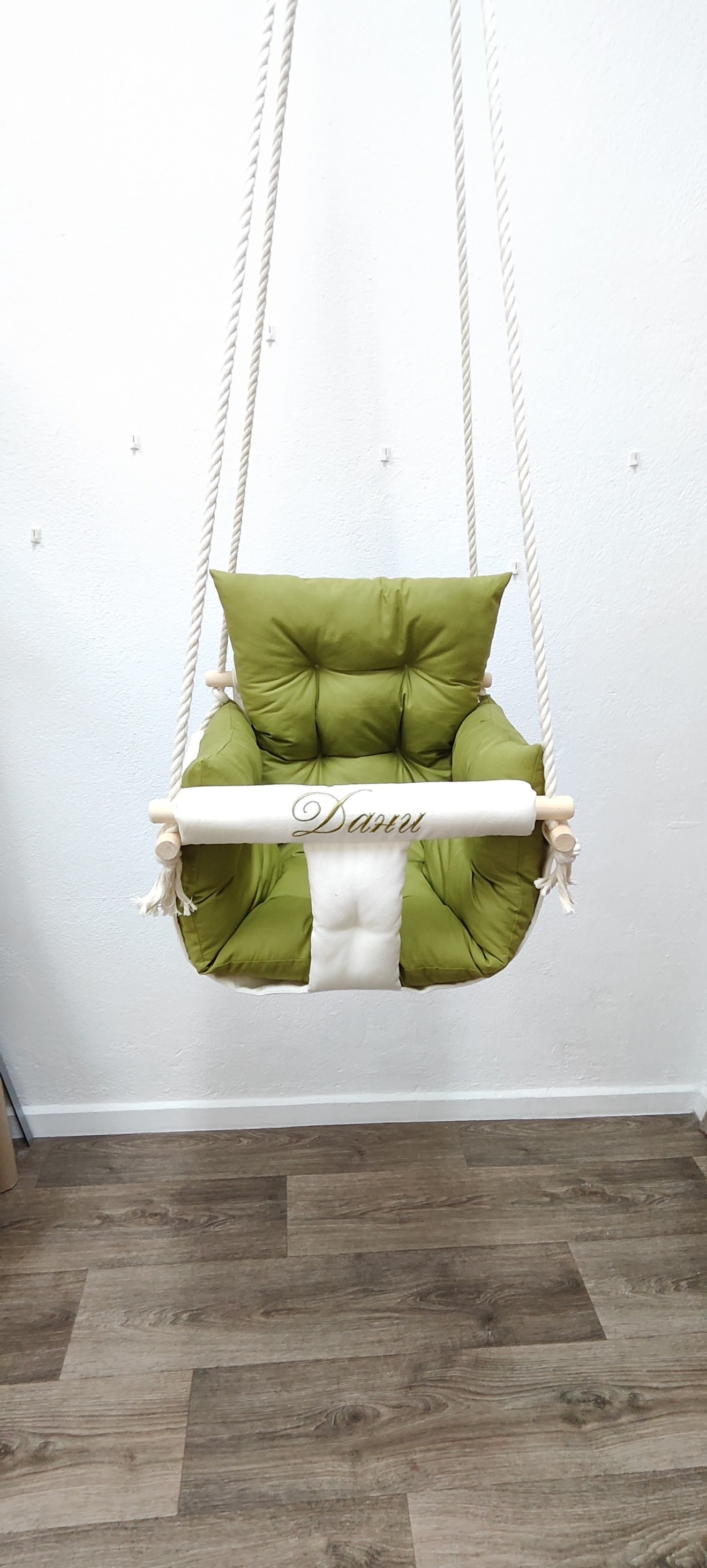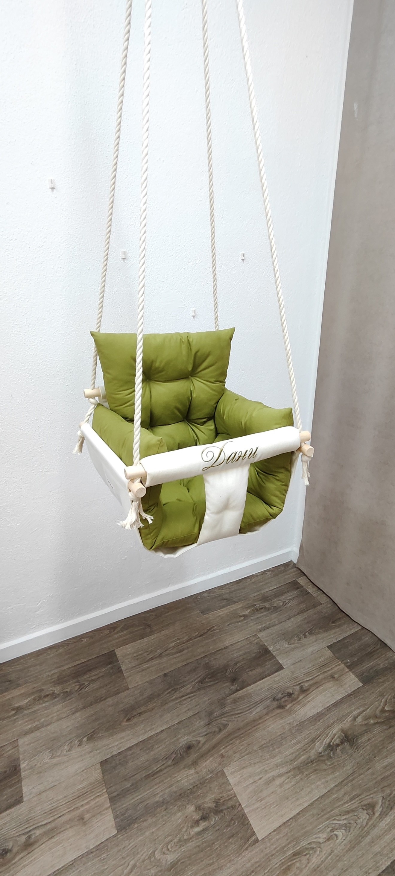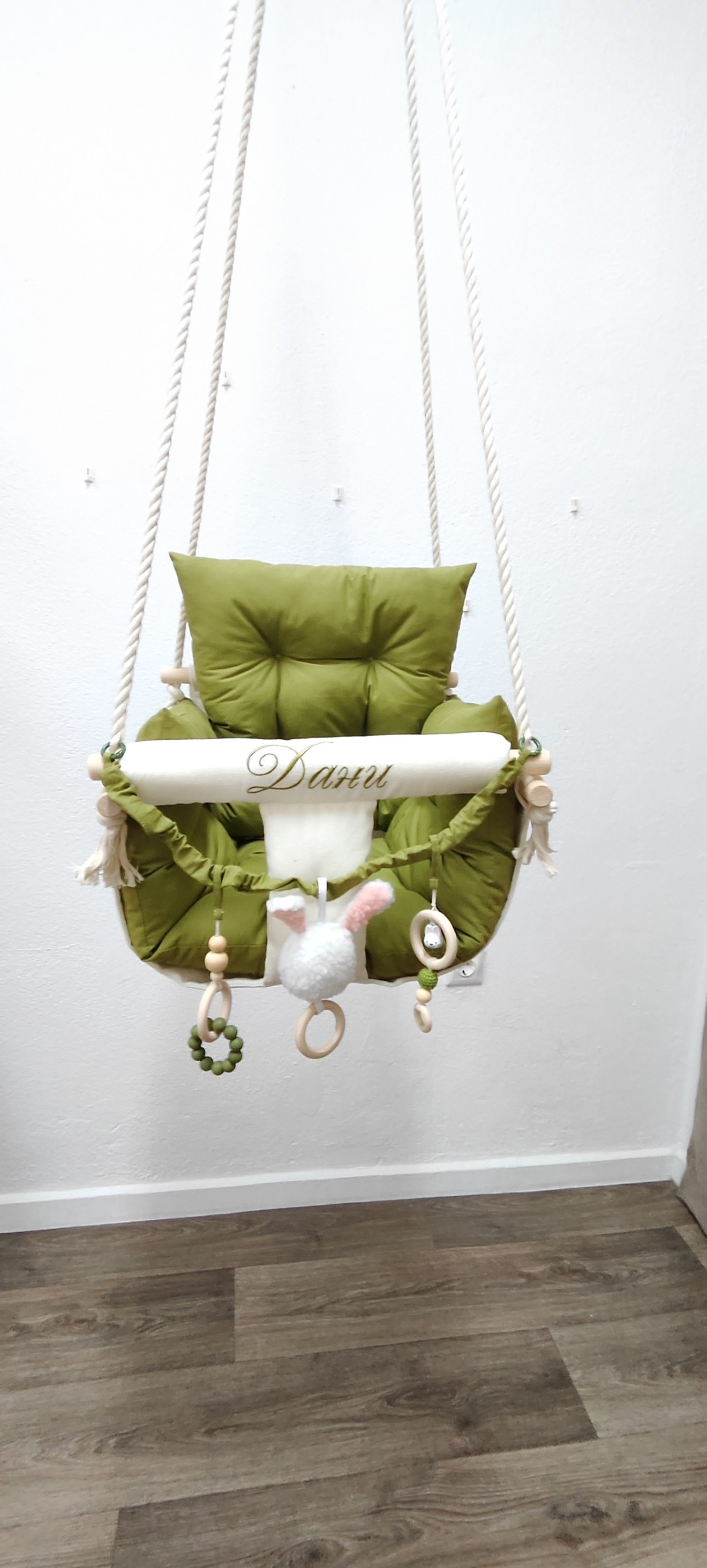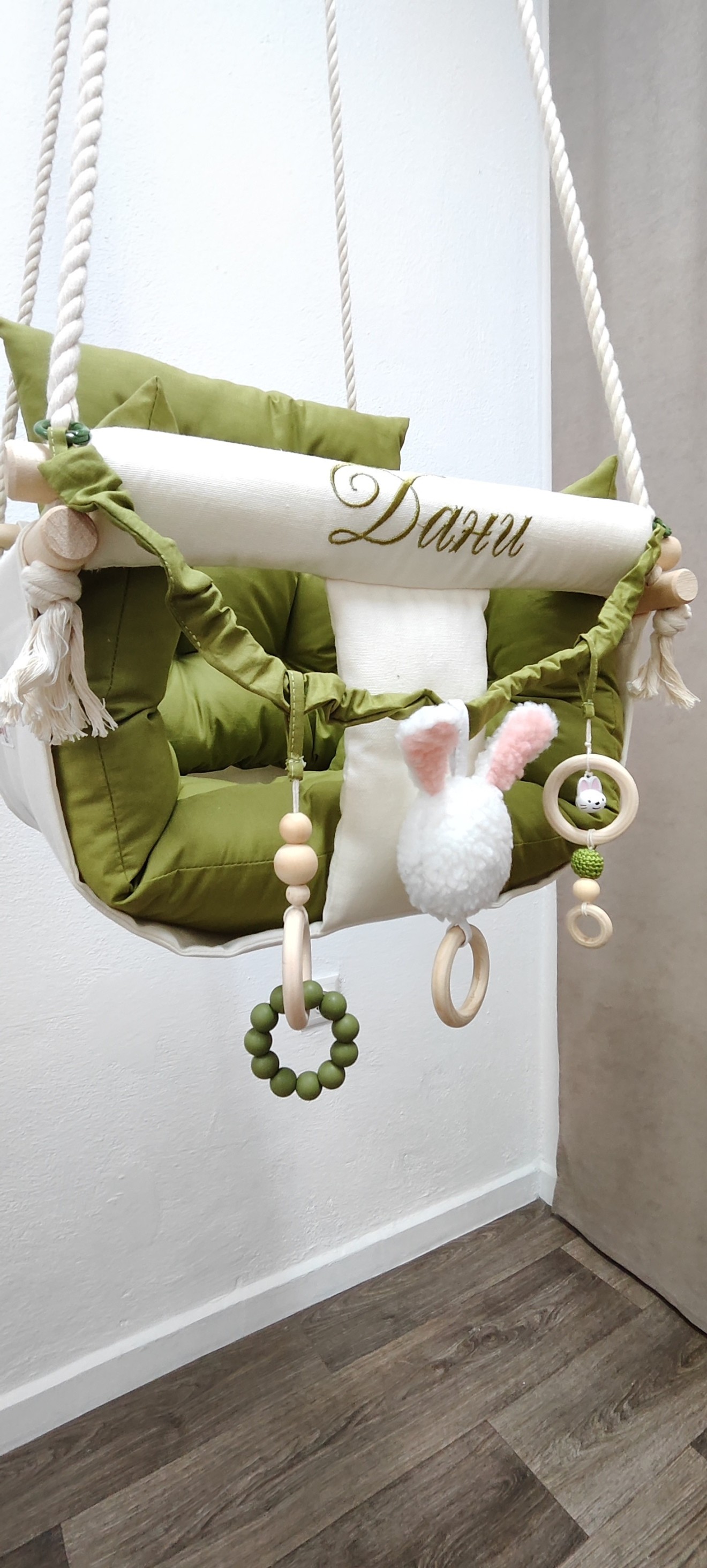 Луксозна бебешка люлка Няма нищо по-хубаво от детския смях, който оглася дома. Сега той може да бъде още по-сладък с нашите ръчно изработени текстилни люлки! - Уют и комфорт: Меки възглавнички и нежни материали. - Забавление: Добаветеиграчки за развиване на фината моторика - Персонализация: Можем да добавим името на вашето дете, за да бъде подаръкът наистина уникален. Направете детството незабравимо. * Цена на люлката - 51 евро * Комплект от 3 броя играчки за закачане - 10 евро * Бродерия на име - 6 евро * Дървени топчета на предните въжета - 4 евро * Предпазен колан - 3.50 евро Разгледайте моделите в онлайн магазина на https://pavalitekids.com
