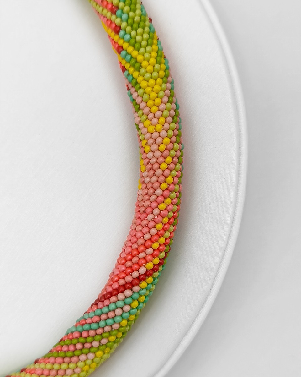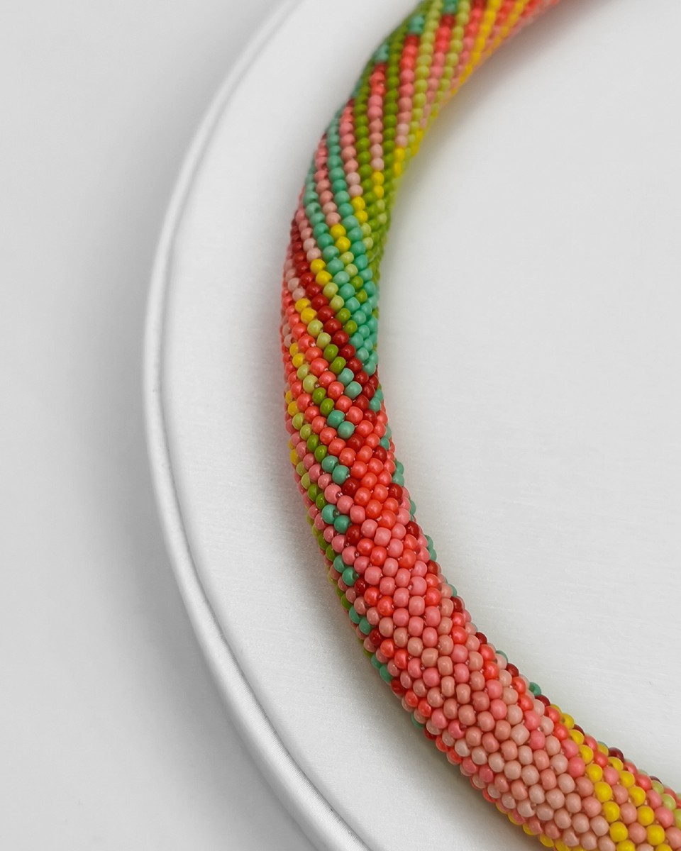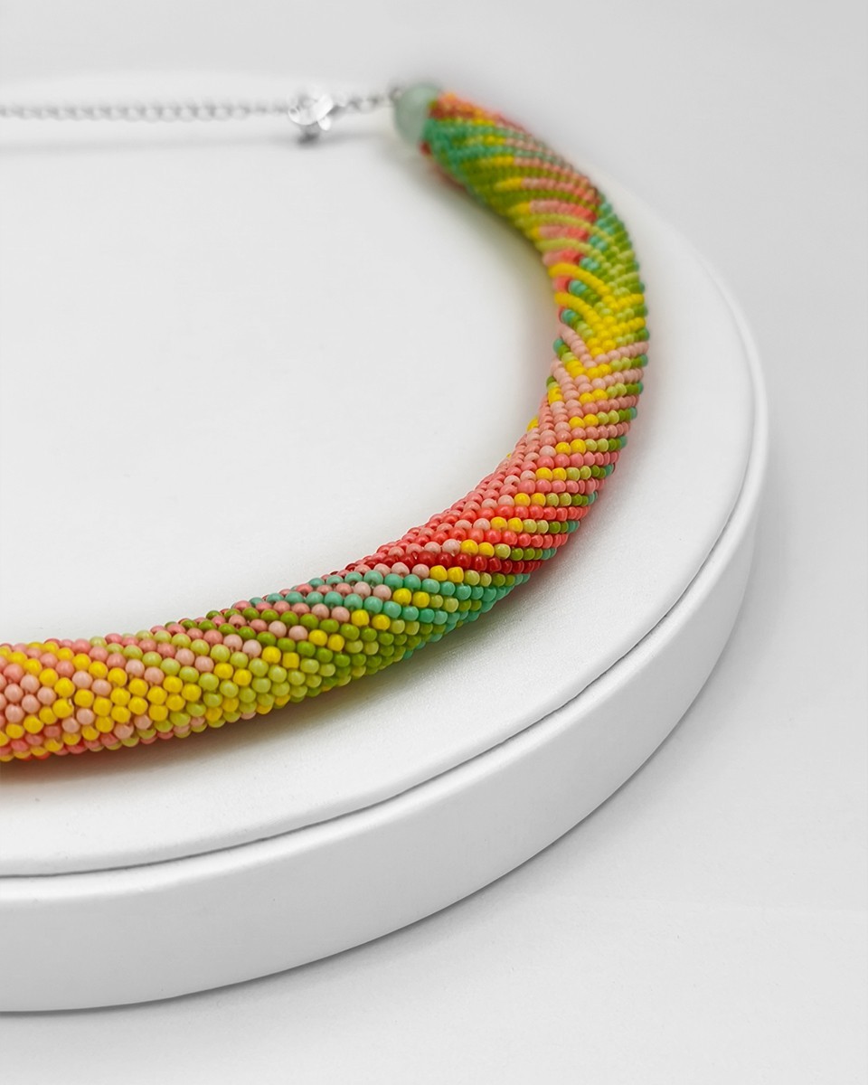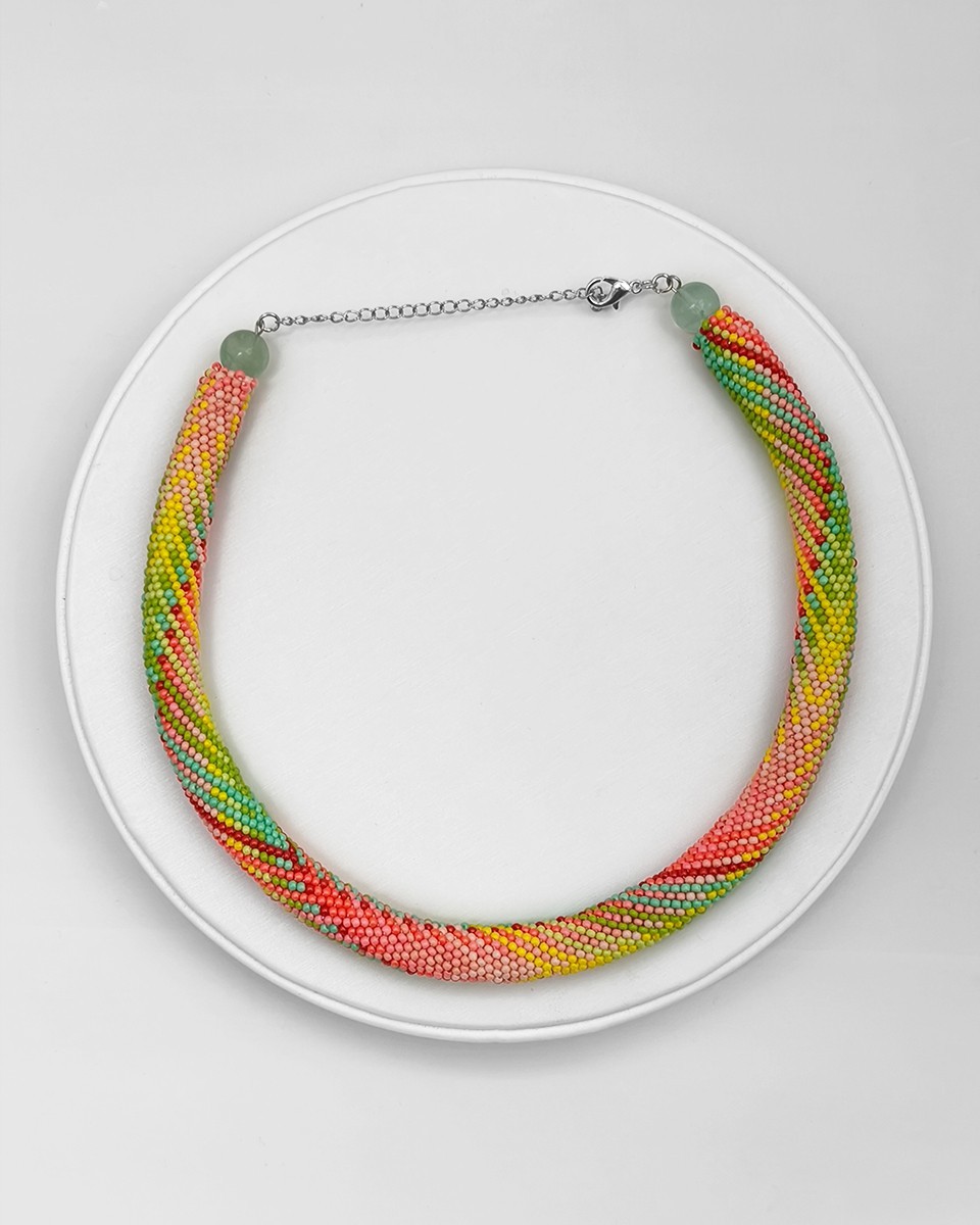 - Чешки мъниста: бежави, прасковени, розови, червени, жълти, тюркоазени, светло и тъмно зелени - Топчета млечен Флуорит 10 мм - Дължина на колието: ~36 см + 7 см верижка - Широчина на колието: ~13 мм - Плетено на ръка Можете да разгледате и други модели във - Фейсбук: collier.jewelry.j.j - Инстаграм: collier.j.j