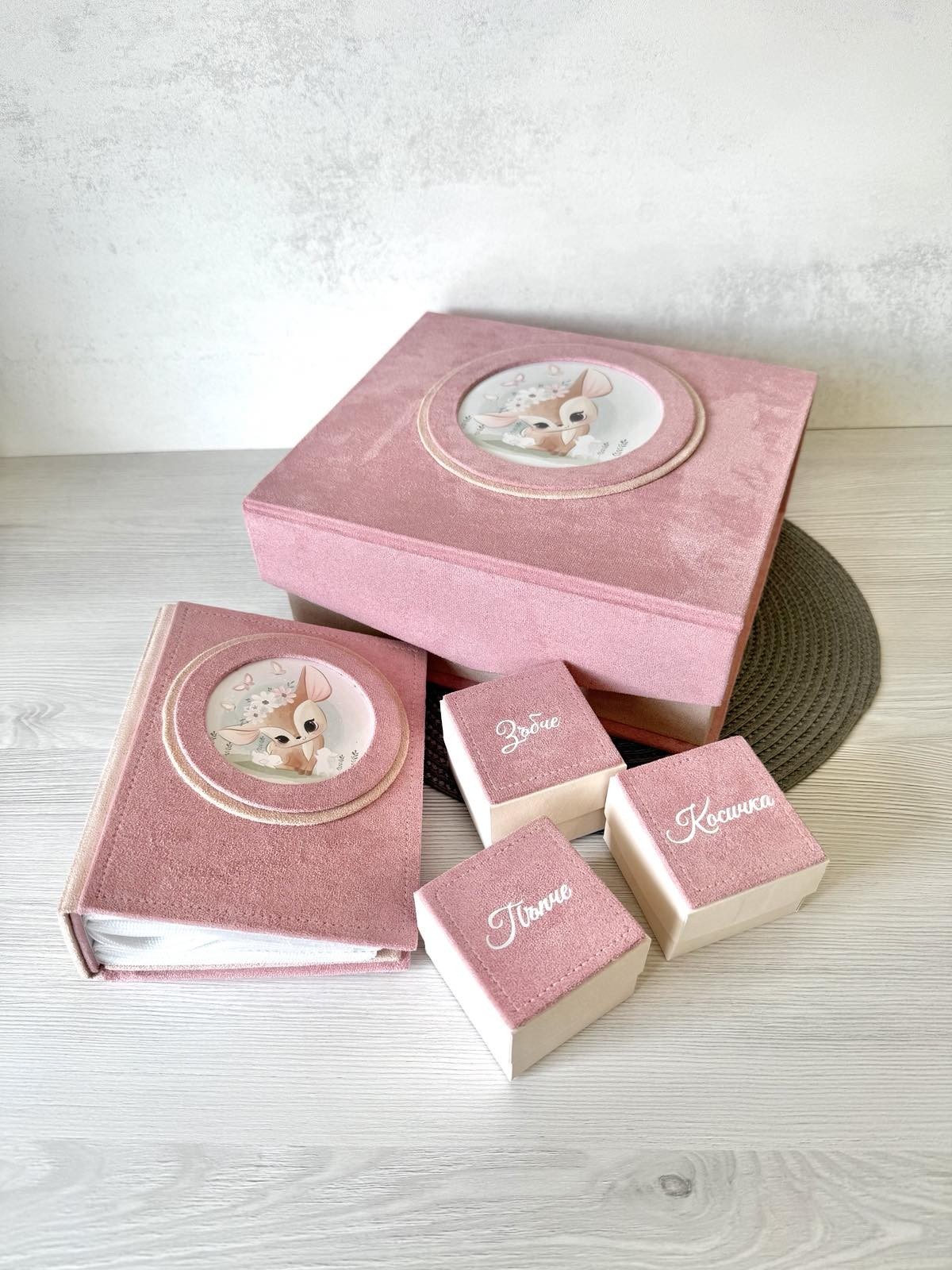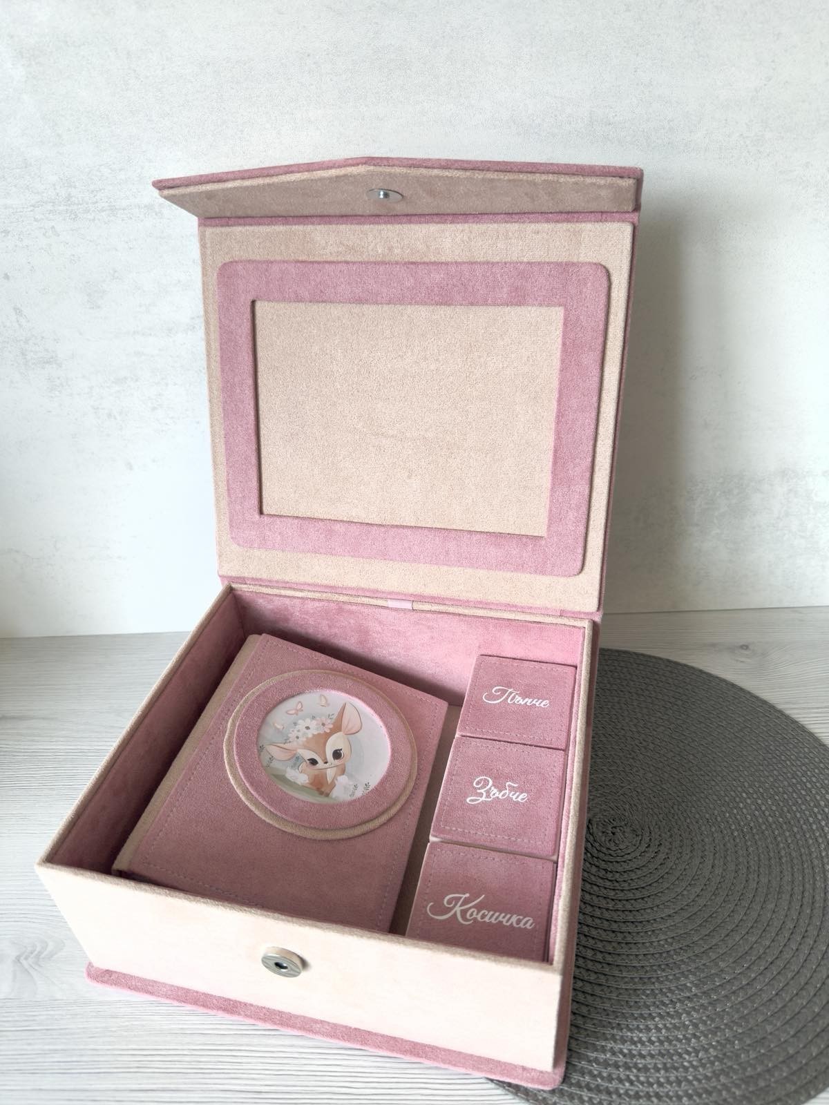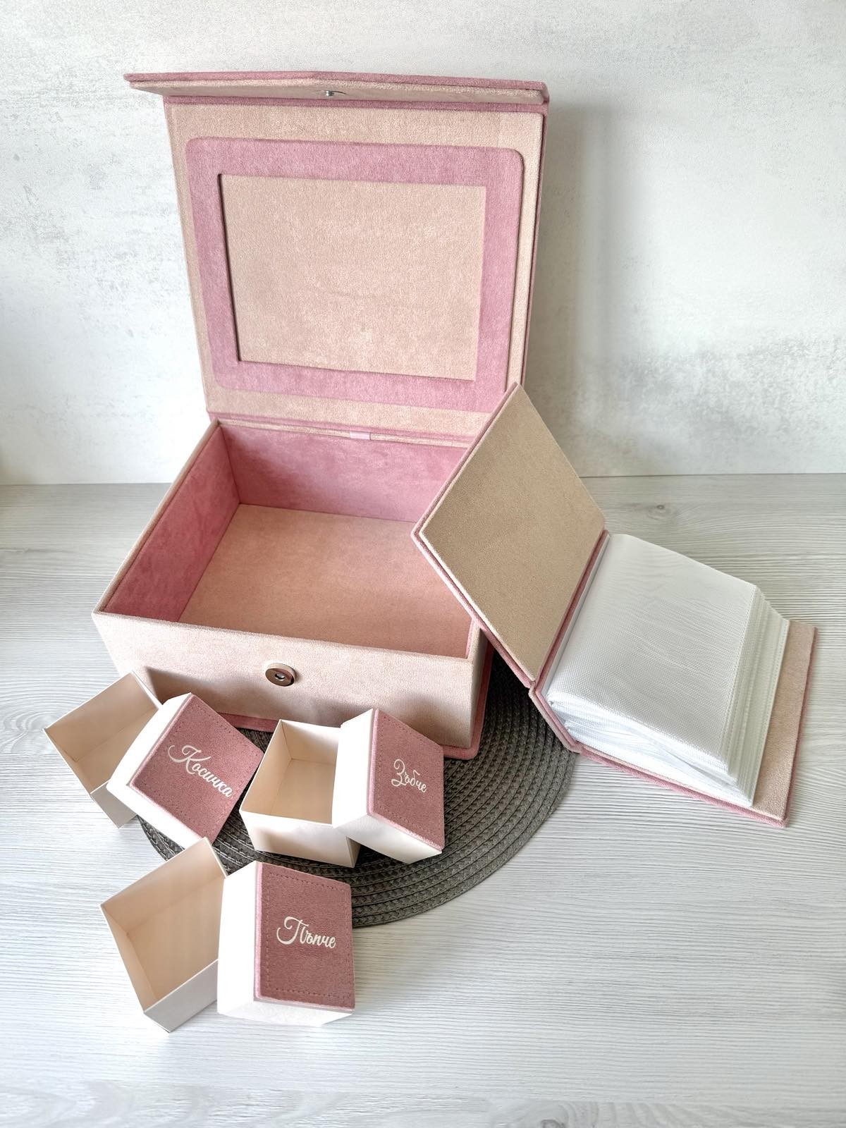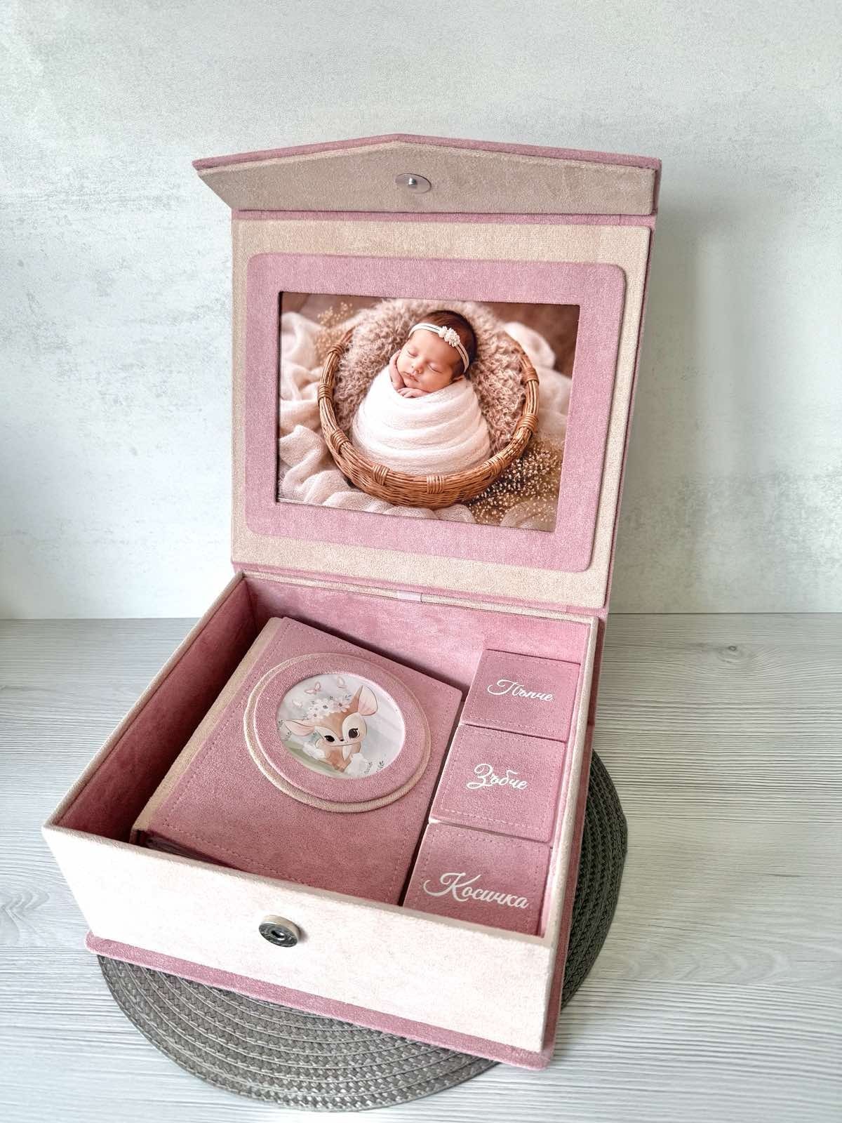 ✔ Албум за 100 снимки (10×15 см) ✔ 3 кутийки – за пъпче, зъбче и косичка ✔ Голяма кутия за съхранение ✔ Рамка за снимка отвътре 📸 Нежен и стойностен подарък за новородено или бъдеща мама 🤍 ✨ Изработка по поръчка ✨ Възможност за персонализация Може да се свържете с мен и на моята страничка във фейсбук Работилничка от мечтите https://www.facebook.com/RabotilnichkaOtMechtite