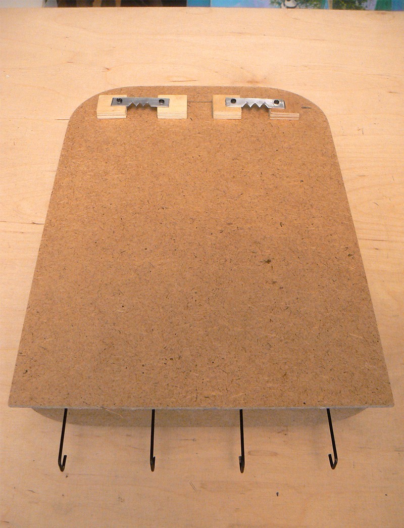 Рисувана/чертана е. С молив, четка, боя, линия, пергел. Отделните елементи са изрязани с макетен нож и дооформени с шкурка. Отзад ламаринките за закачане и кукичките също са ръчно направени. Размерите и са 18 на 26 см. Направена е само една бройка, уникална е.