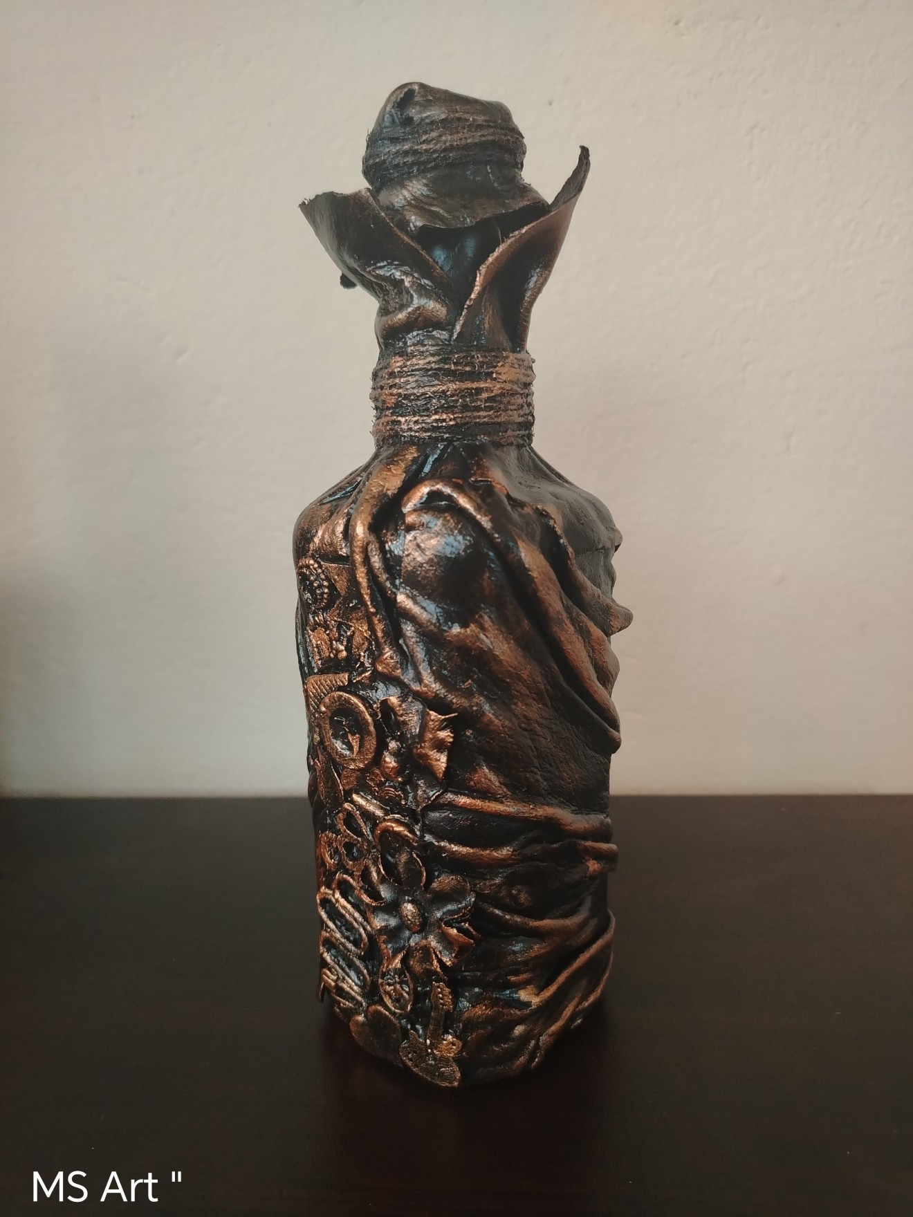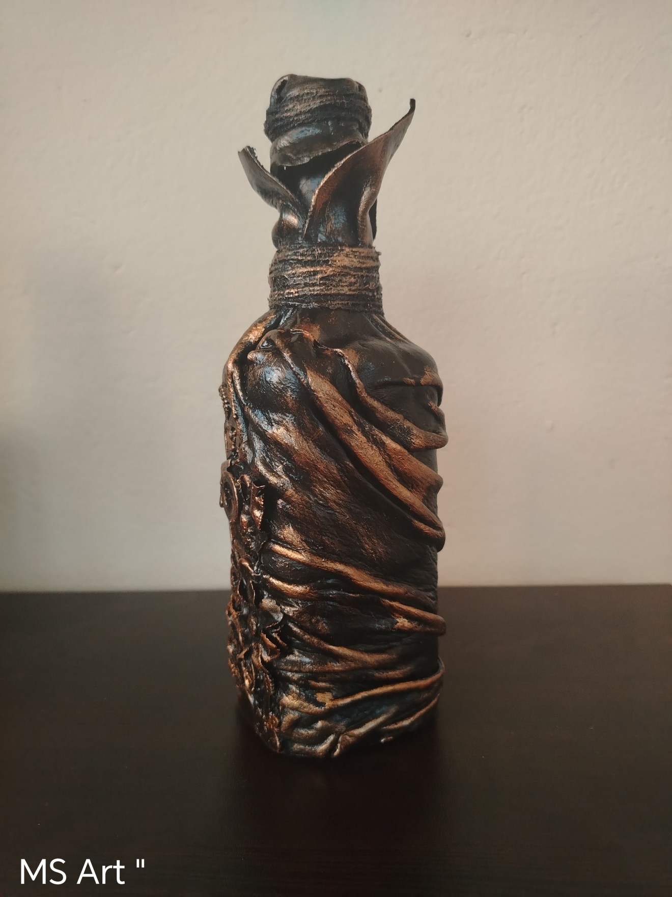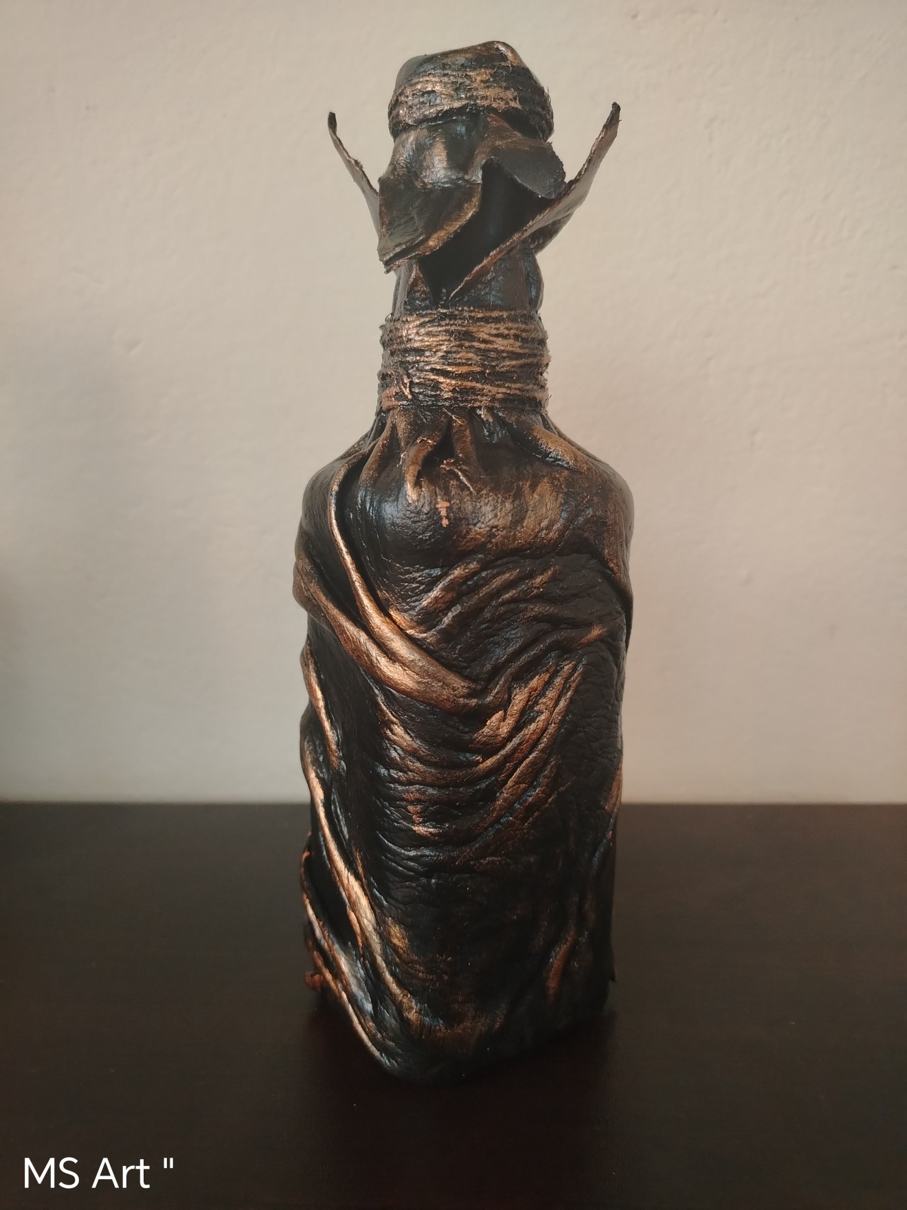 #Handmade #Art #mixedmedia #Ръчна #изработка Бутилка Ръчно декорирана с естествена кожа с техниката mixedmedia, боядисана с акрил и многопластово лаково покритие, налична за продажба.