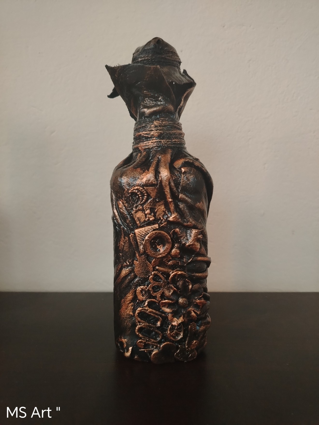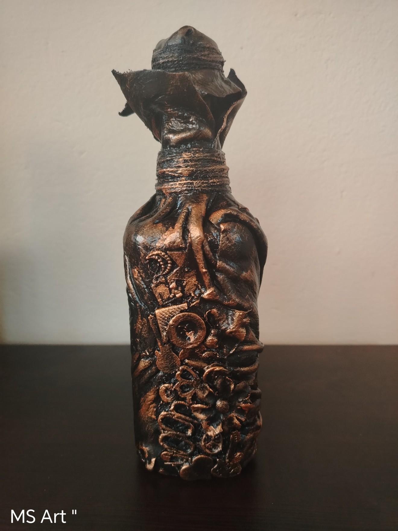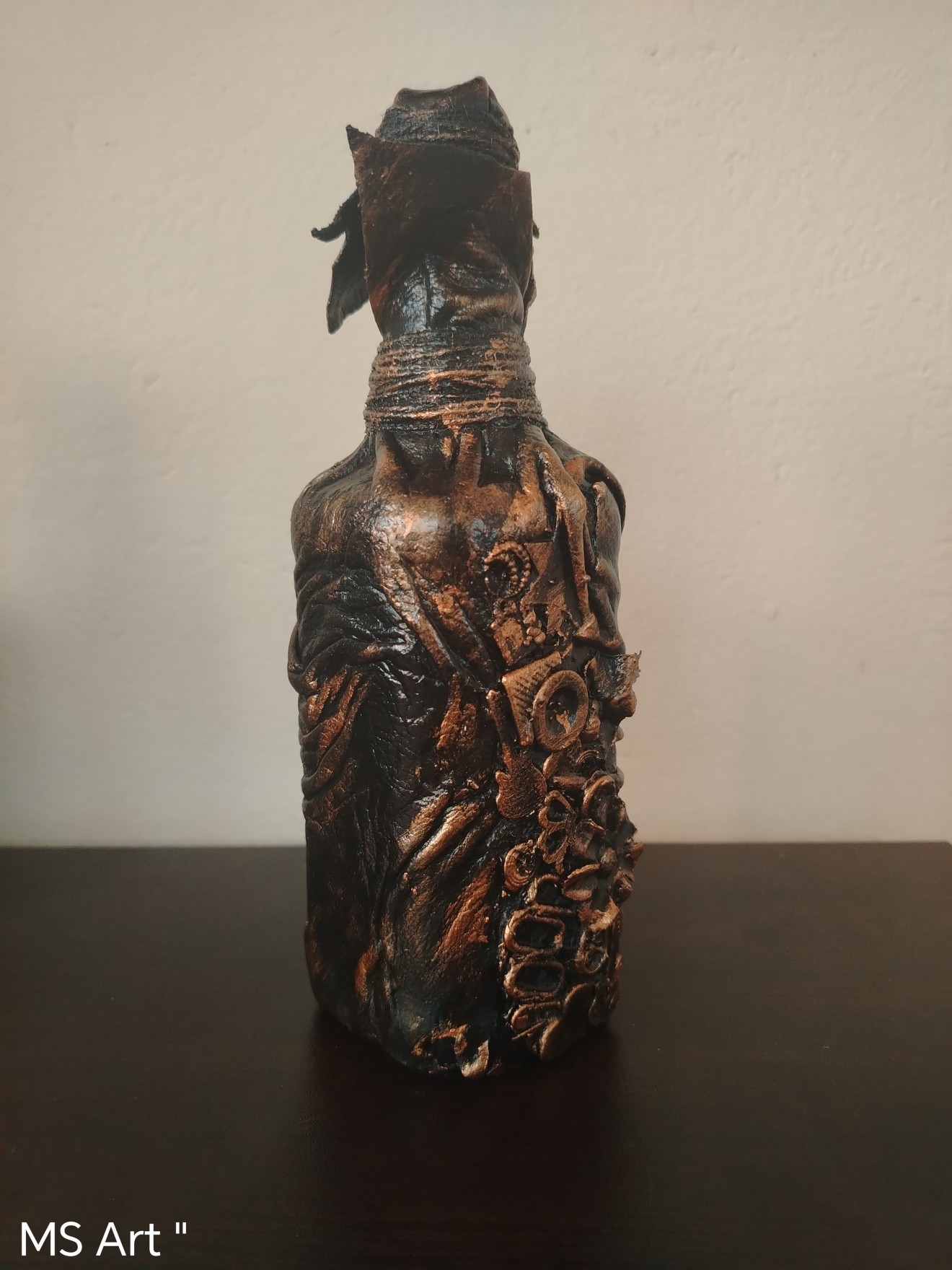 #Handmade #Art #mixedmedia #Ръчна #изработка Бутилка Ръчно декорирана с естествена кожа с техниката mixedmedia, боядисана с акрил и многопластово лаково покритие, налична за продажба.