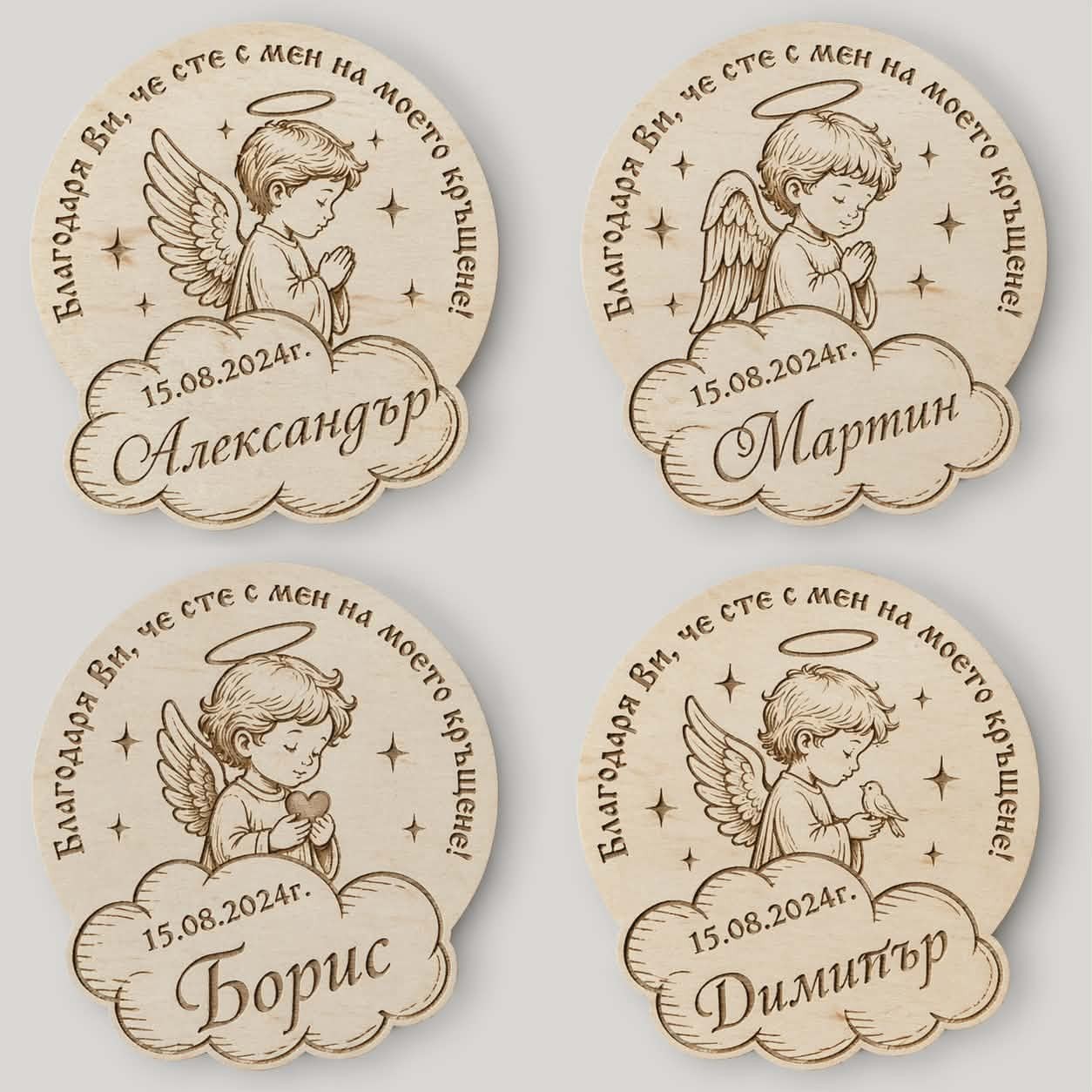 Търсите красиво и запомнящо се подаръче за гости? Изработвам дървени ангелчета с име и дата, които остават мил спомен от този специален ден 💛 ✔️ Персонален дизайн (име + дата) ✔️ Подходящи за подаръци на гости ✔️ Висококачествено лазерно гравиране ✔️ Бърза изработка 🎁 Подходящи за: – Кръщене – Подарък за близки – Спомен от събитието