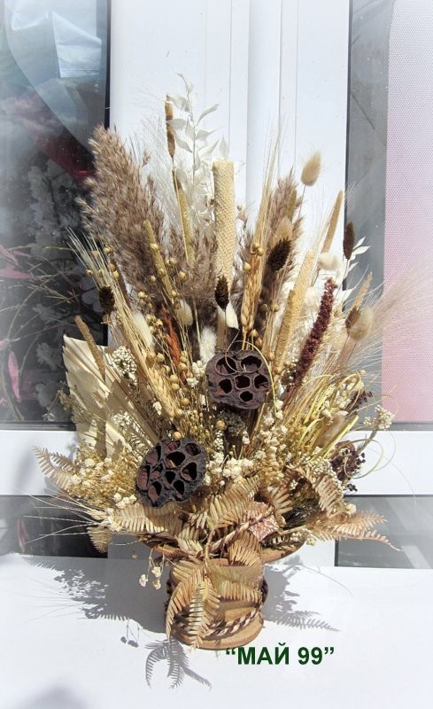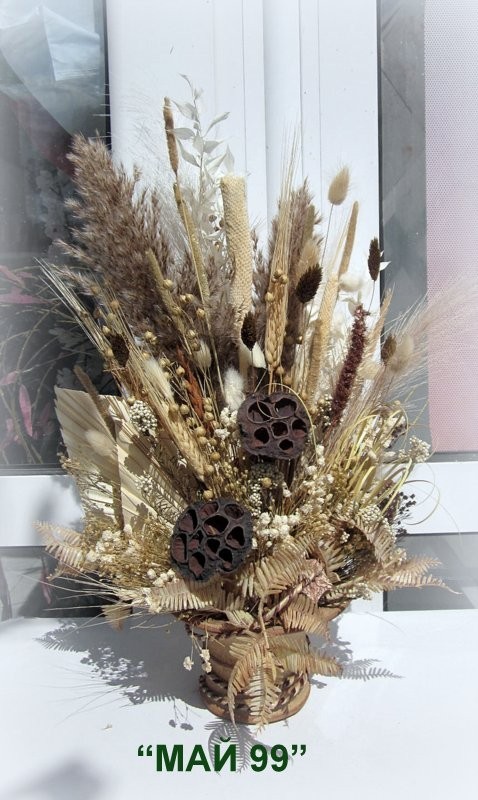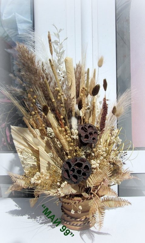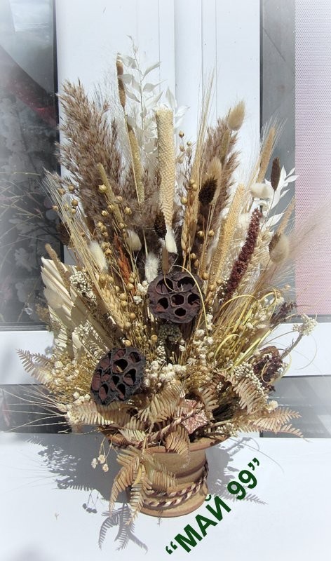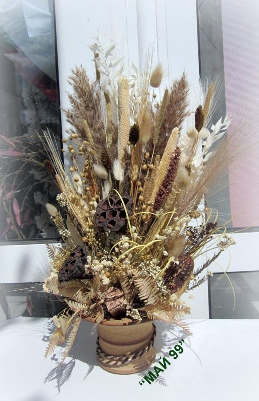 Аранжировка в керамична кашпа със сухи треви,цветя и натурални елементи,пампанска изкуствена трева и житни класове с височина 50 см.