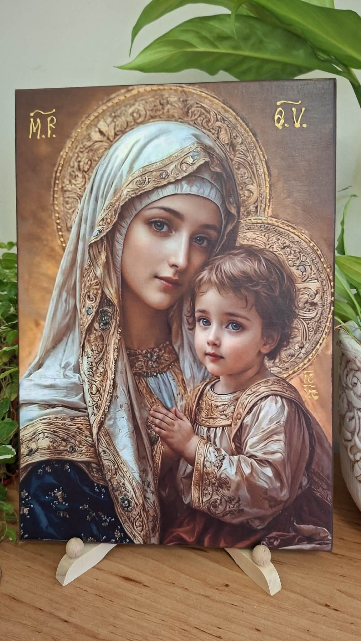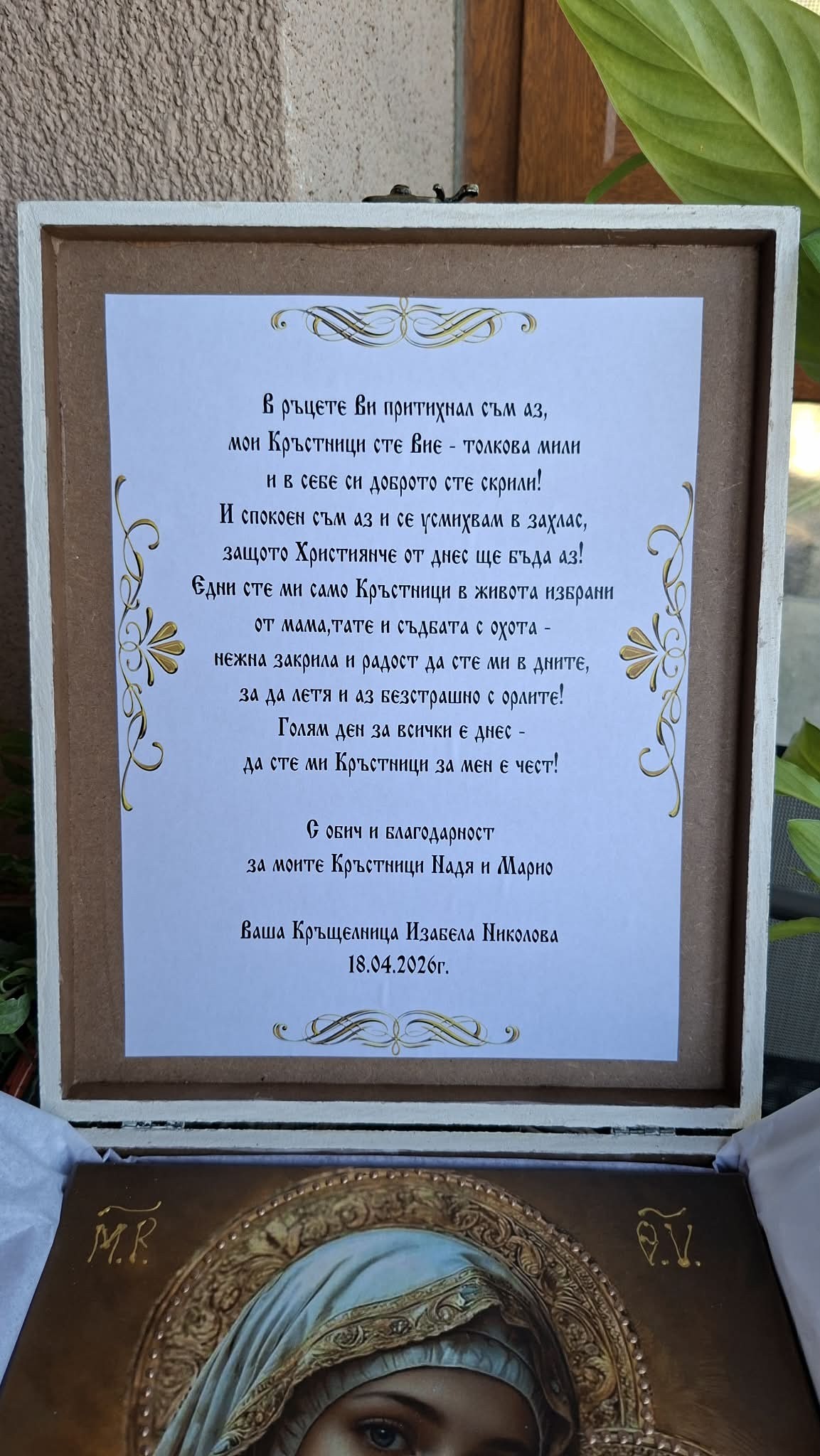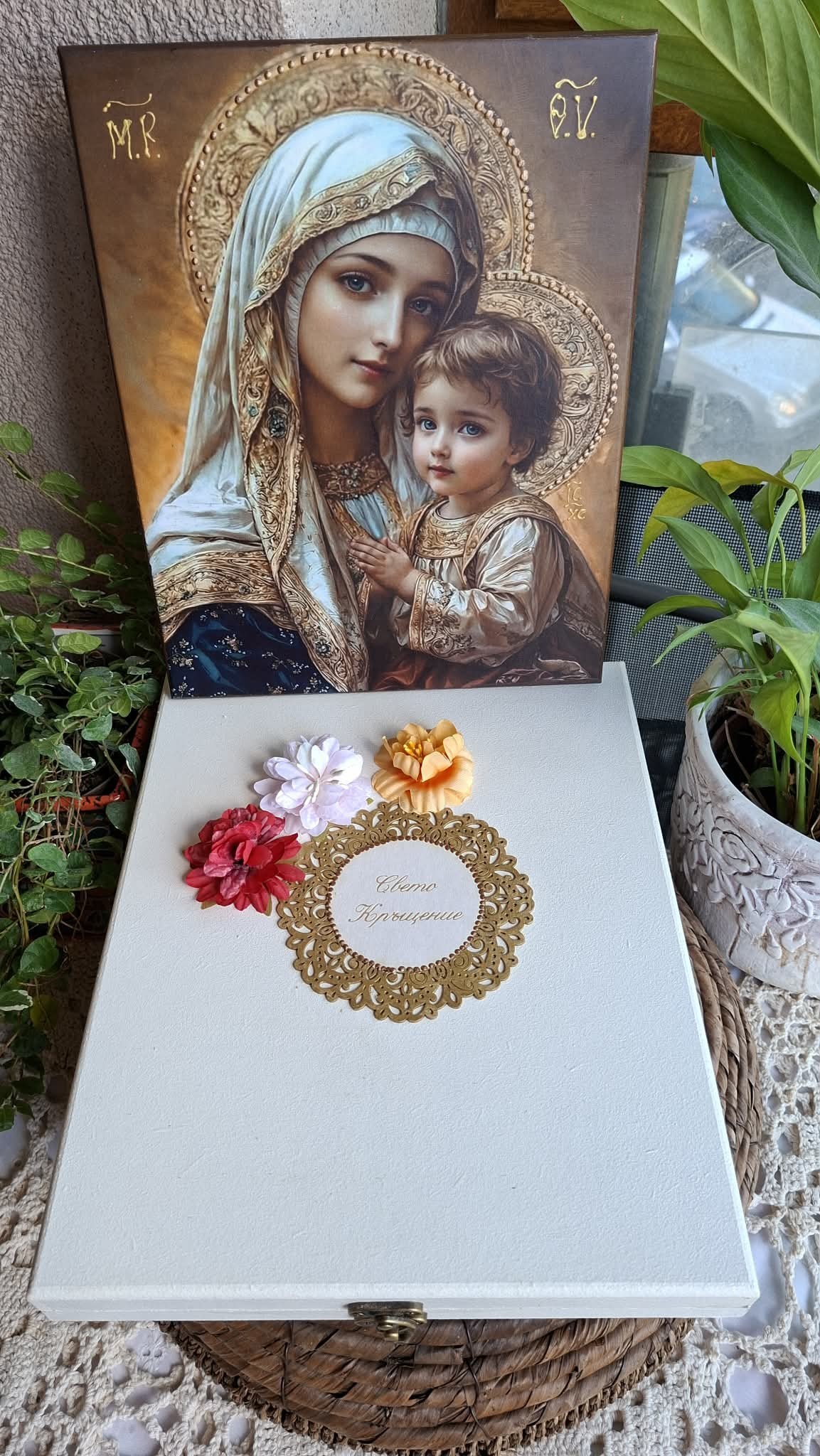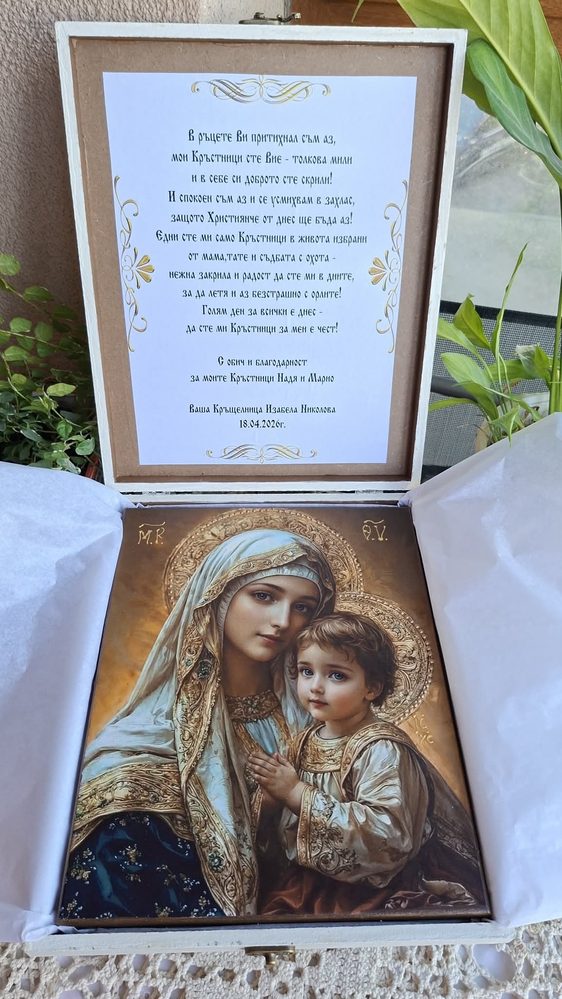 Персонализирана Икона"Умиление" в луксозна дървена кутия-Дар за Кръстниците на малката Изабела и нейното Свето Кръщение. ✨ Смесена техника,акрилни бои,антични и битумни пасти,контури,байц,е;ементи от бирен картон и цветя,лак и пчелен восък Иконата е с размер 20/25/2см. а кутията 22/27/4см. Такъв комплект може да бъде изработен и аранжиран изцяло по Ваше желание за различни поводи-Юбилей,Нов дом,Сватба,Свето Кръщение и други. По Ваше желание Иконата може да бъде опакована и декоирана бяла картонена кутия.