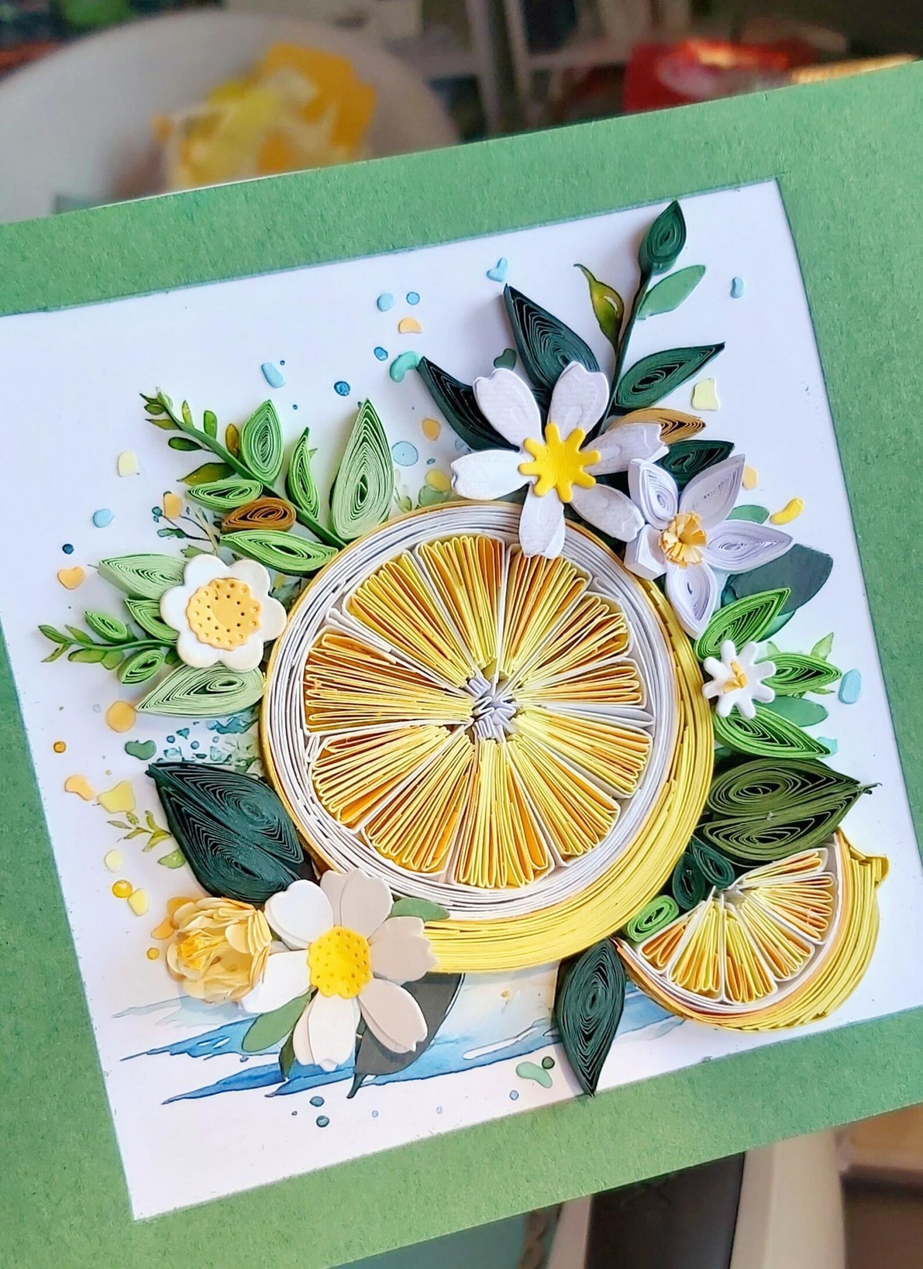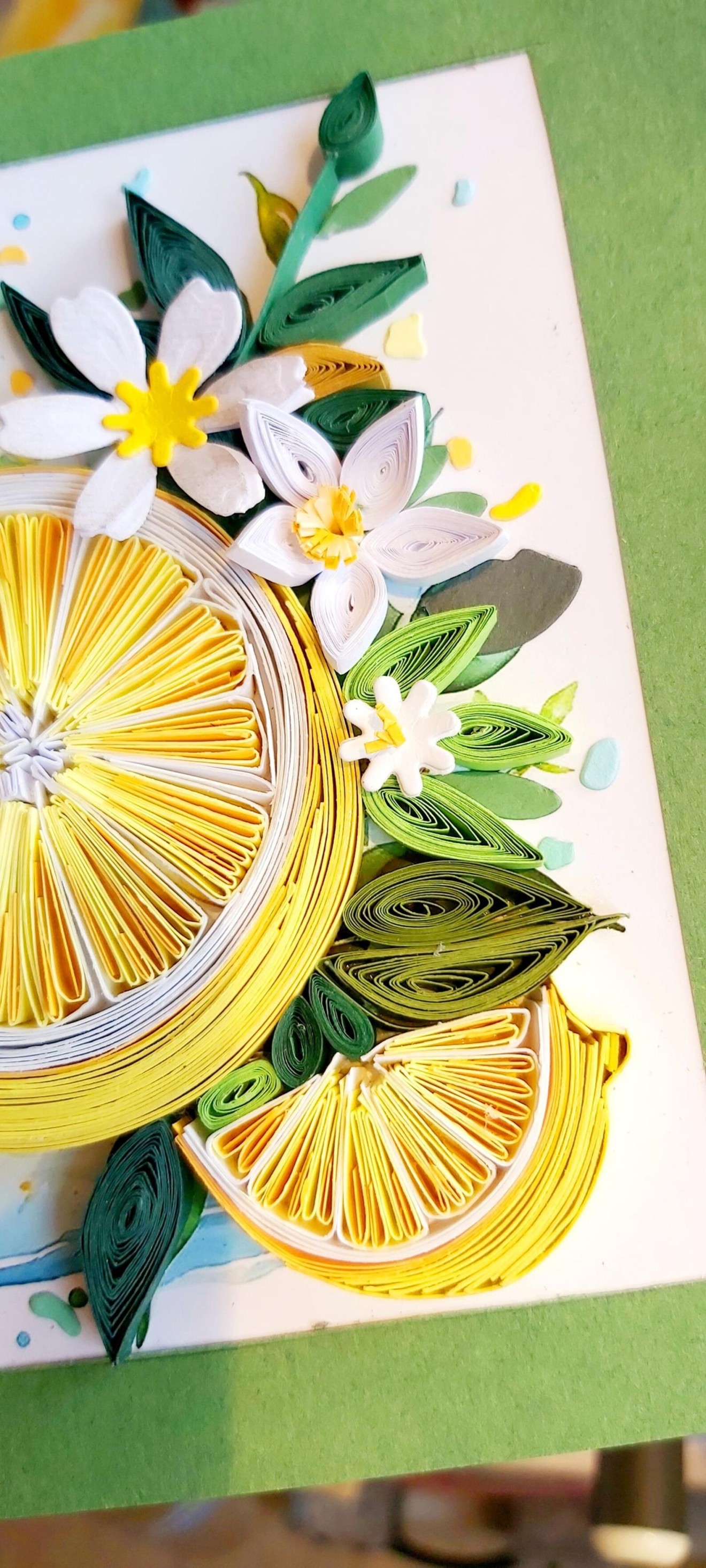 Ако животът ти поднесе лимони, направи си лимонада! Лимоните са изработени с квилинг техника. Ширината на картонените ленти е 5 мм. Рамкирани в дълбока рамка и са защитени със стъкло. Идеални са за декорация на кухня или дневна и са страхотен подарък за рожден ден или нов дом. Размери: 16.5 x 21.5 x 4 см Изпращане с НП до офис на Спиди/Еконт