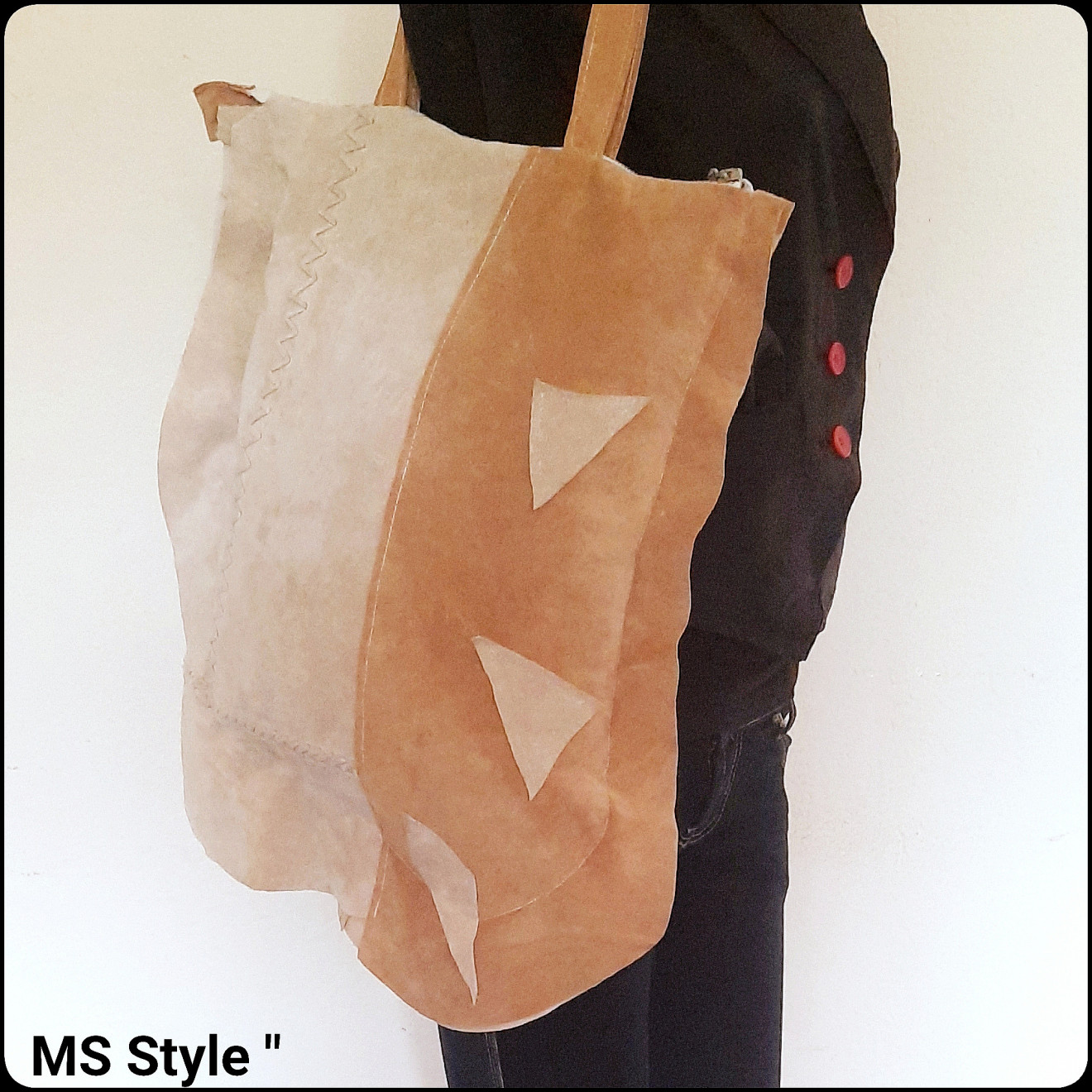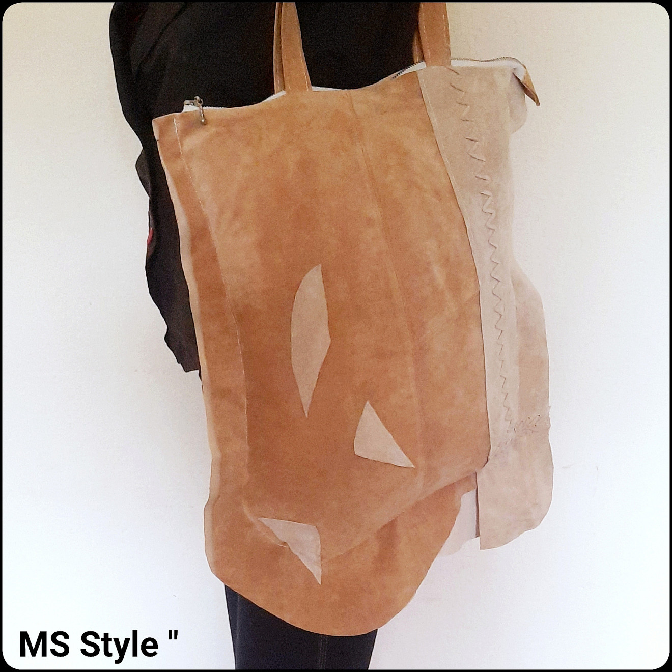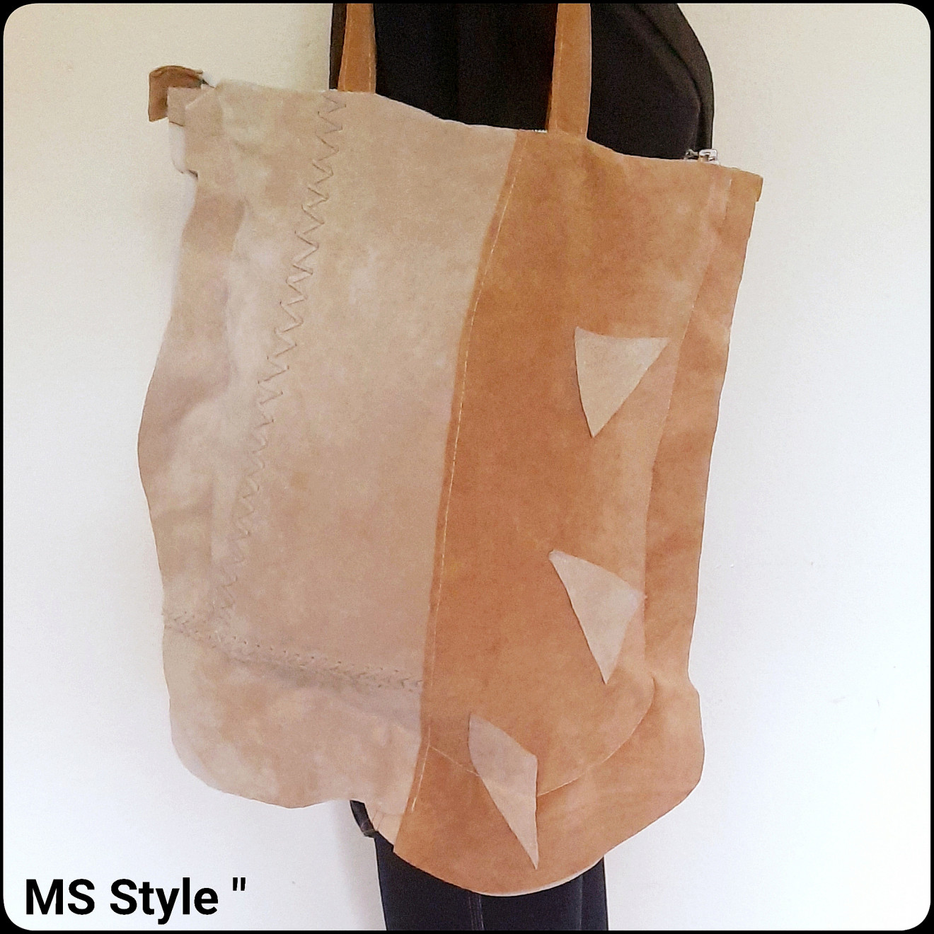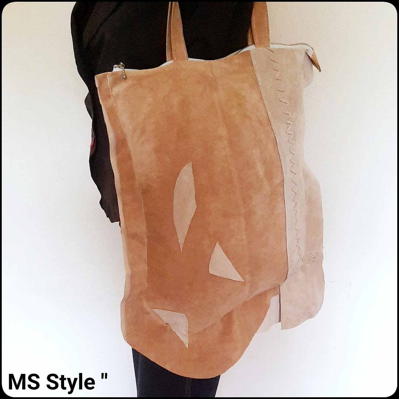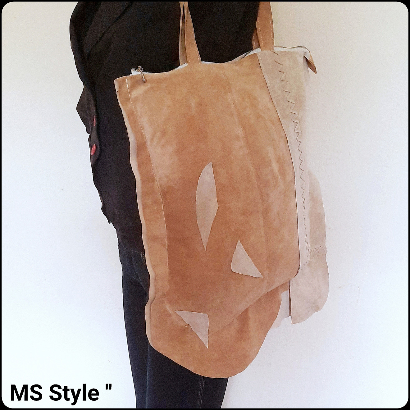 #Асиметрична #дамска #чанта от #естествена #кожа с #две #лица! Чантата е #ръчно #изработена от мека #естествена #кожа - #велур, #различна от двете страни, с #едно #отделение закопчава се с #цип, с #хастар и #вътрешен #джоб, цена 58 лв.