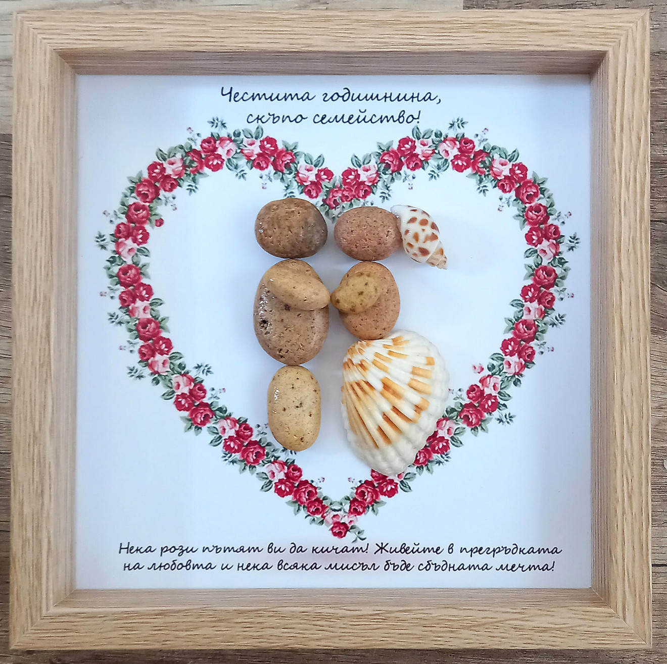 Пано "Годишнина от сватба", изработено от морски камъчета и раковинки. Размери 19,5/19,5 см. Текст по избор.
