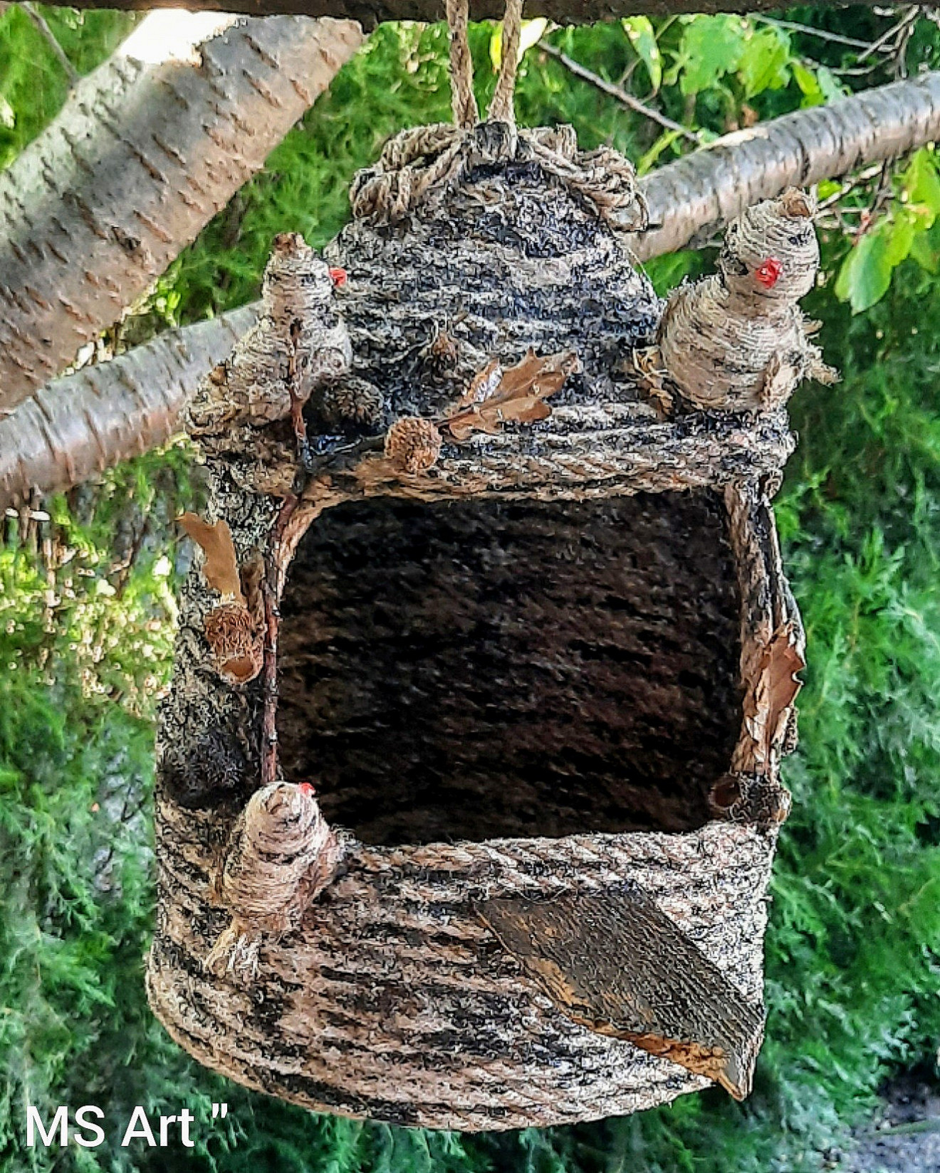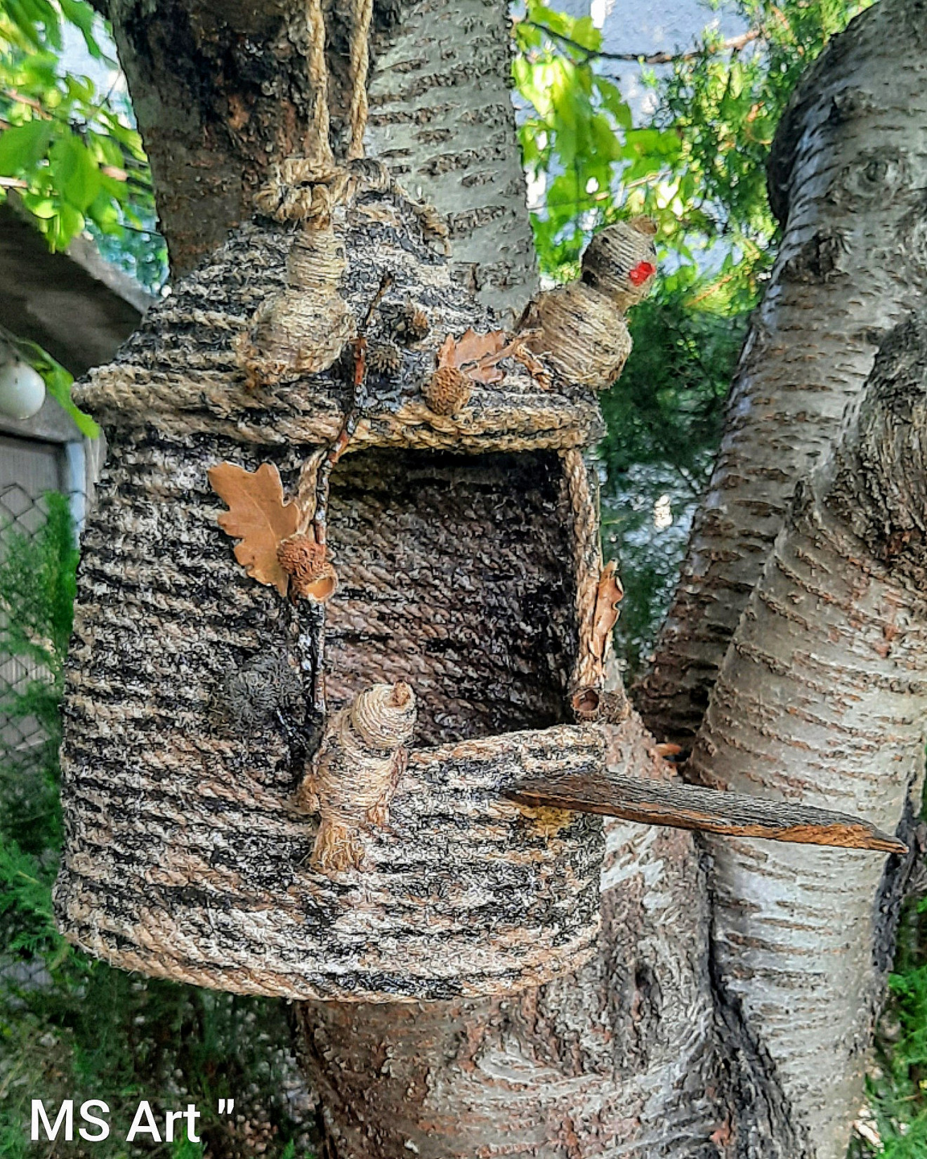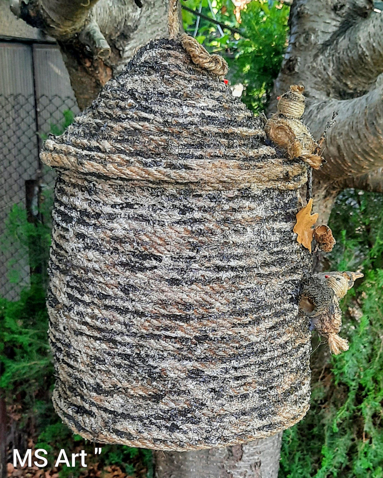 #Градинска #декорация! #Декоративна #къщичка за #птици от #конопено #въже и още нещо... Къщичката е #ръчно #изработена от #конопено #въже, с #декорация от #естествени #клонки с #жълъди, #дамска, #ръчно #изработени #птички от #канап, дорисувана с #акрилни #бои и запечатана с многопластово #лаково #покритие, готова за окачване, с плоско дъно което позволява да е настолна, височина без окачването 37 см, дъно с диаметър 24 см, цена 62 лв.