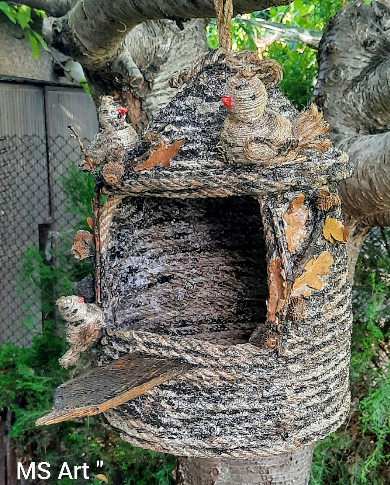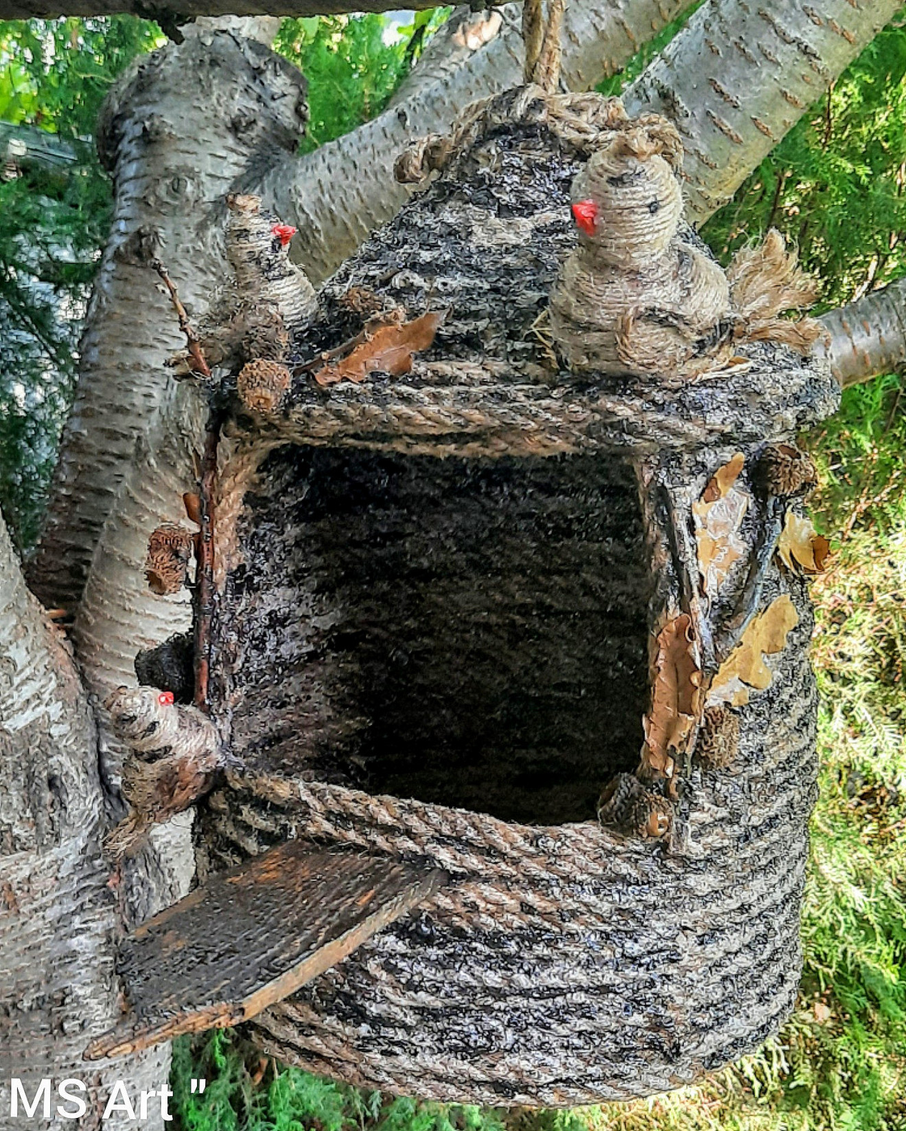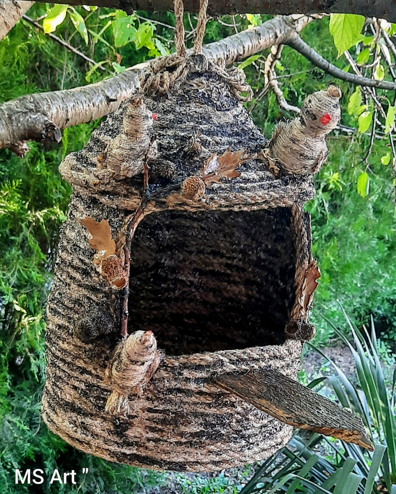#Градинска #декорация! #Декоративна #къщичка за #птици от #конопено #въже и още нещо... Къщичката е #ръчно #изработена от #конопено #въже, с #декорация от #естествени #клонки с #жълъди, #дамска, #ръчно #изработени #птички от #канап, дорисувана с #акрилни #бои и запечатана с многопластово #лаково #покритие, готова за окачване, с плоско дъно което позволява да е настолна, височина без окачването 37 см, дъно с диаметър 24 см, цена 62 лв.