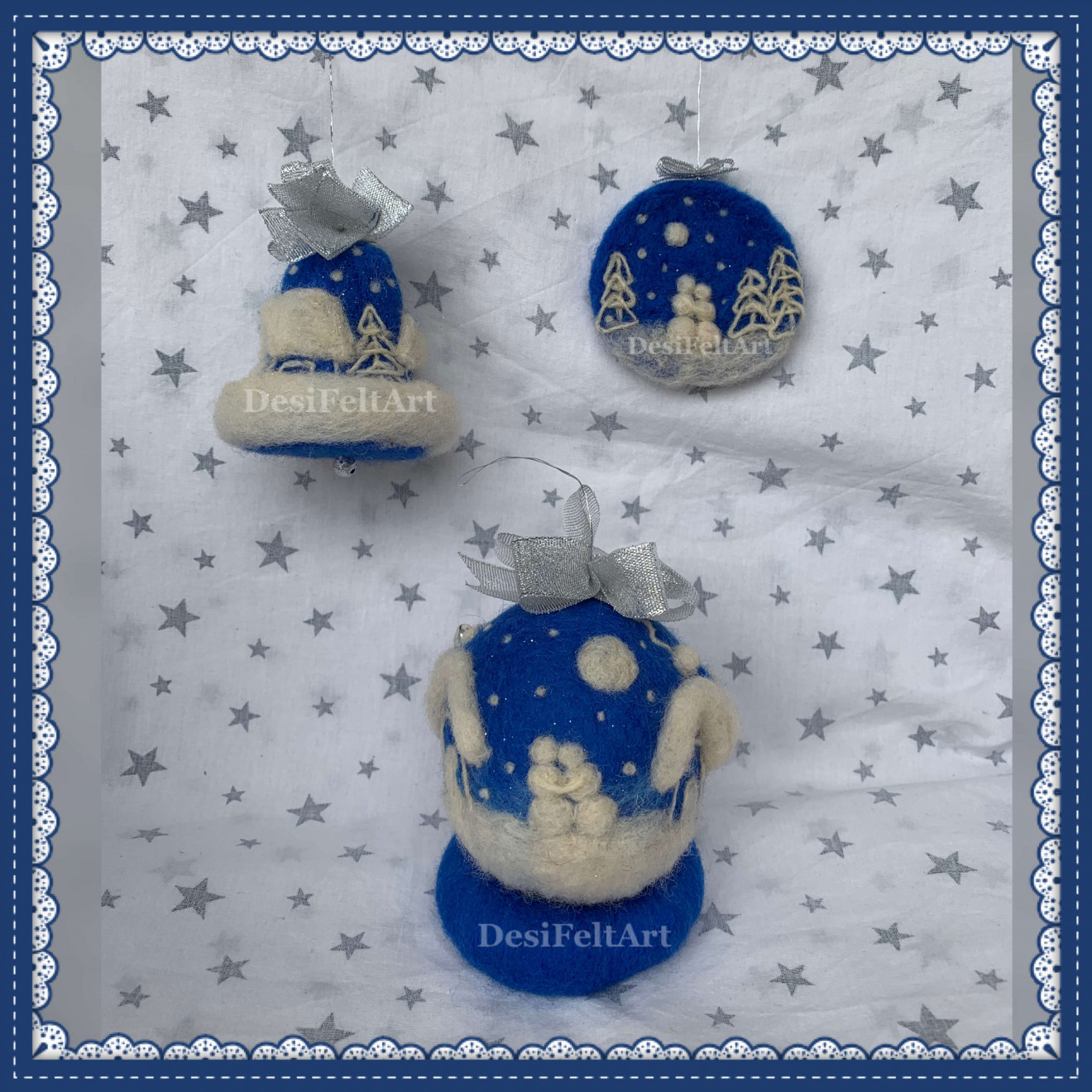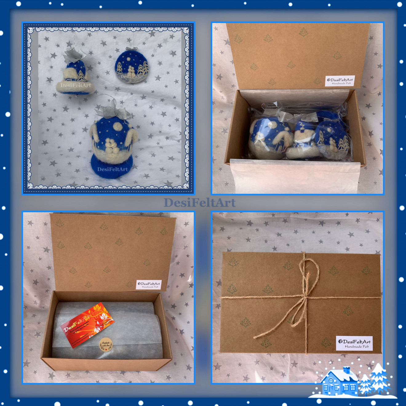 Комплектът включва: * Коледна 3D топка за елха - 8см * Коледна 3D камбанка - 7см * Коледна 3D играчка за елха - 7см Ръчно изработени от вълна, чрез техника мокро и сухо плъстене. Основата на топката и камбанката са стиропор. Комплектът е красиво опакован и готов за подаряване!