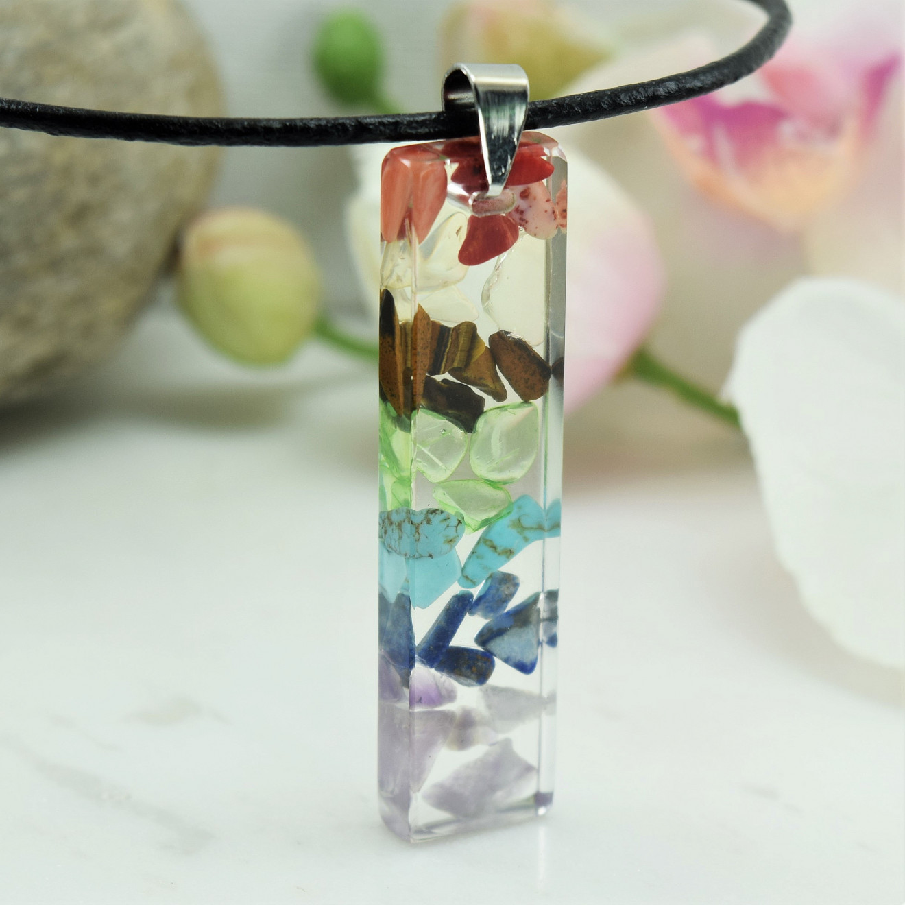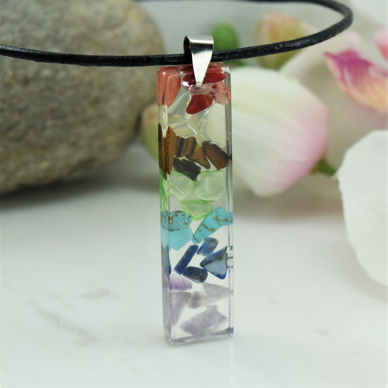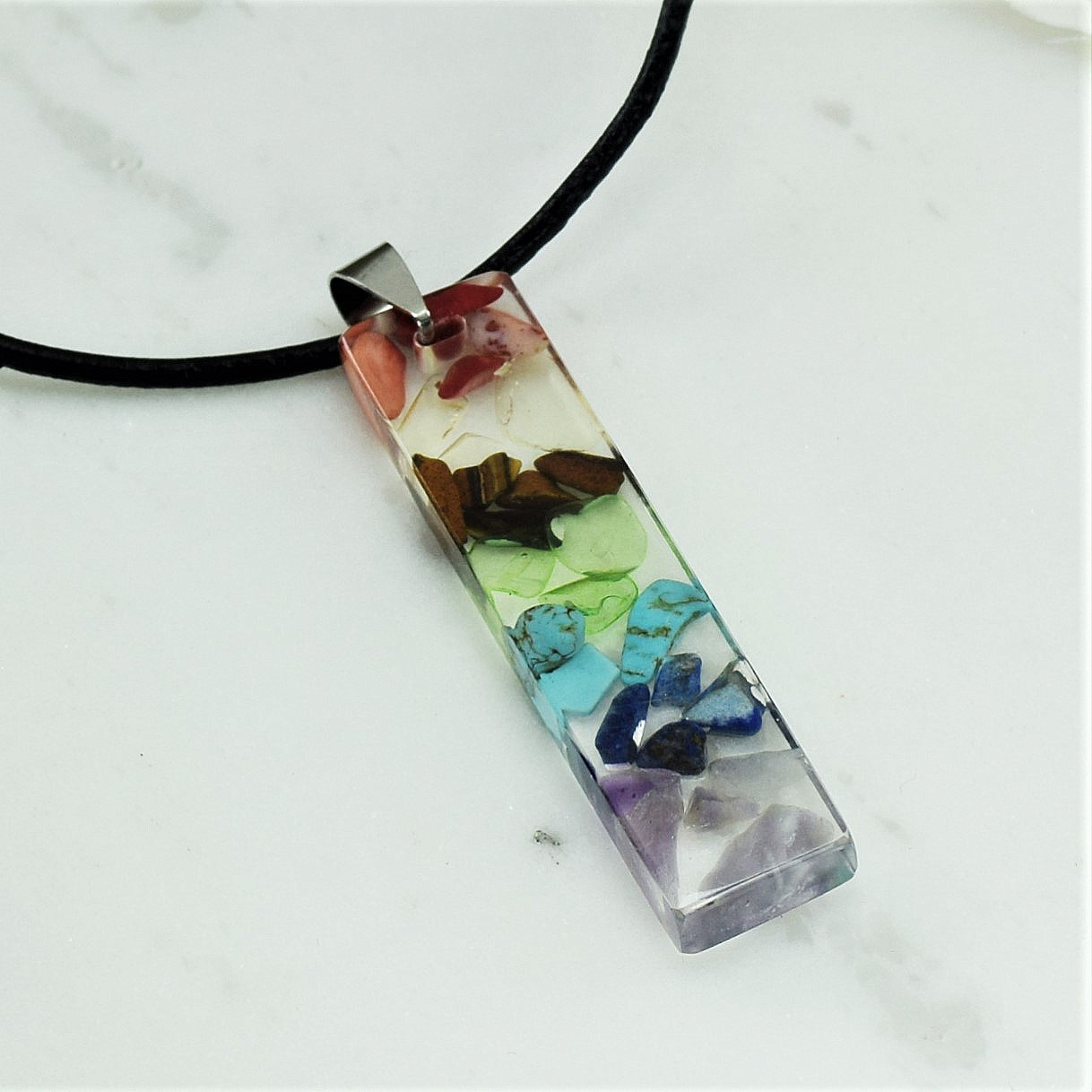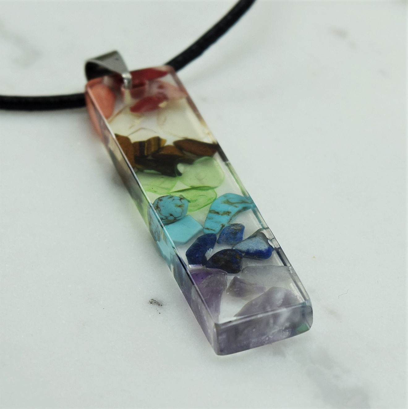 Ръчно направено колие от смола " Седем Чакри ". Състои се от висулка направена от смола с вградени естествени камъчета Аметист, Лапис Лазули , Тюркит Зелен кварц, Тигрово Око , Жълт кварц и Корал ,и черна кожа . Размер на висулката 4,8см/ 1,2см , дължина на колието 58см