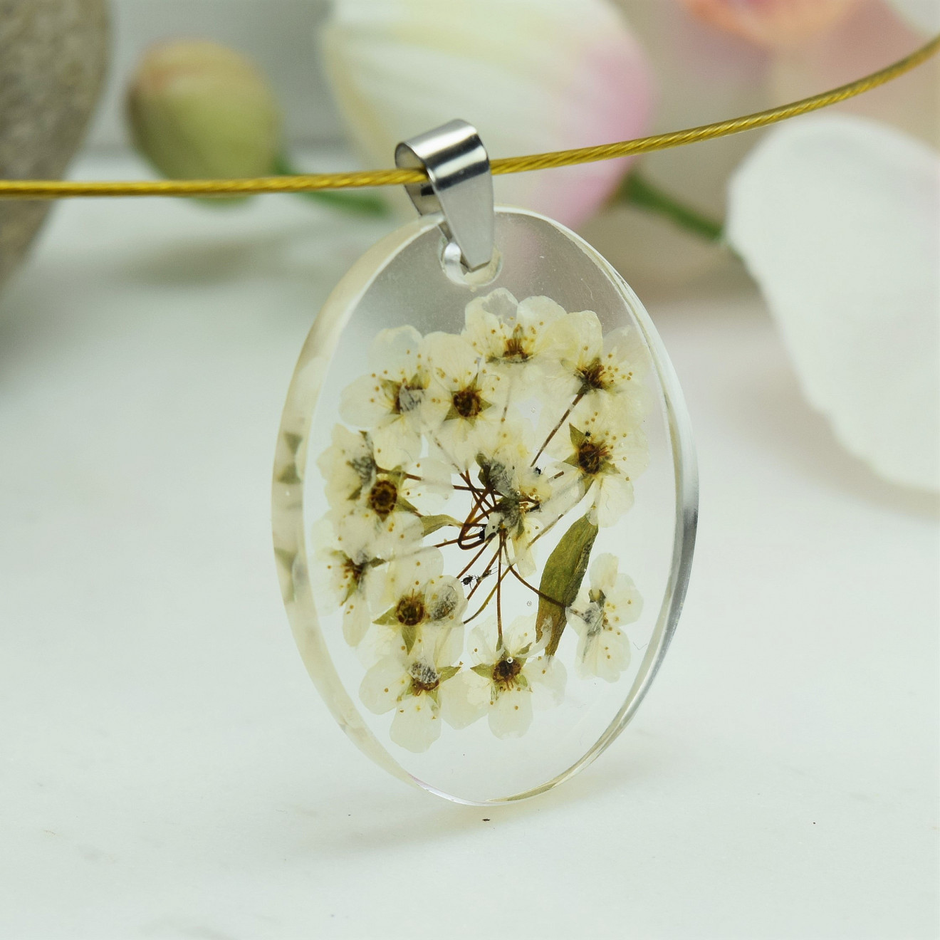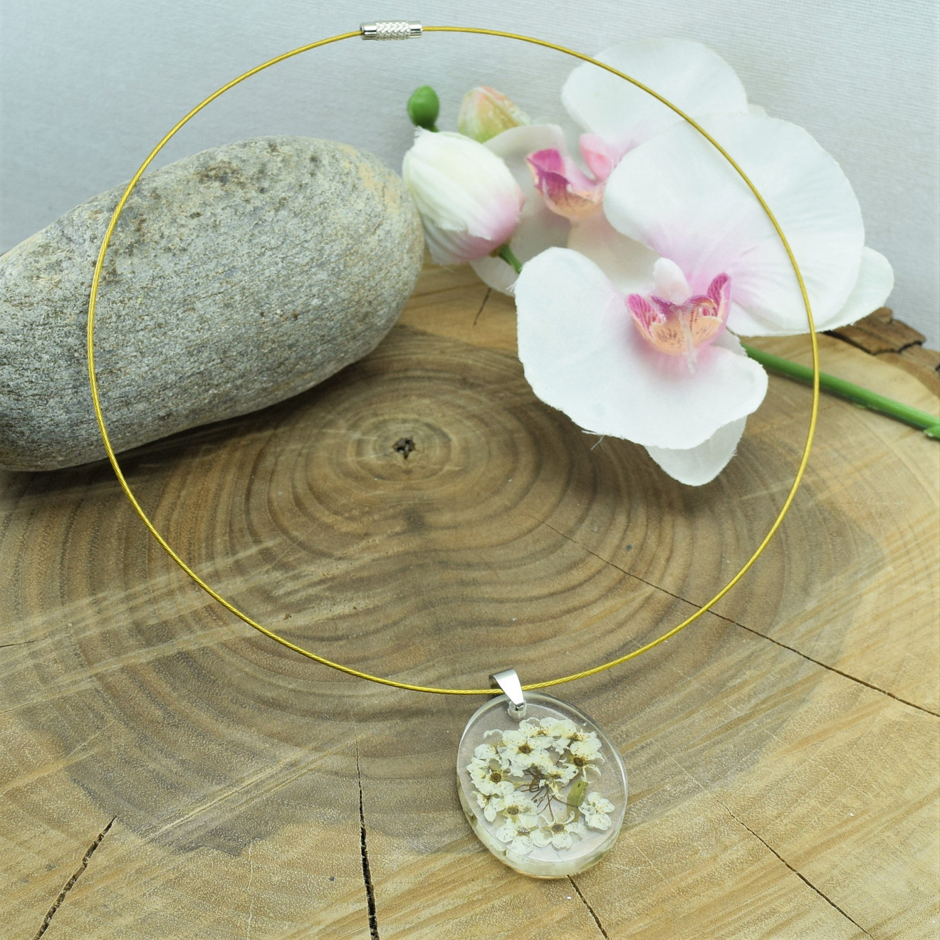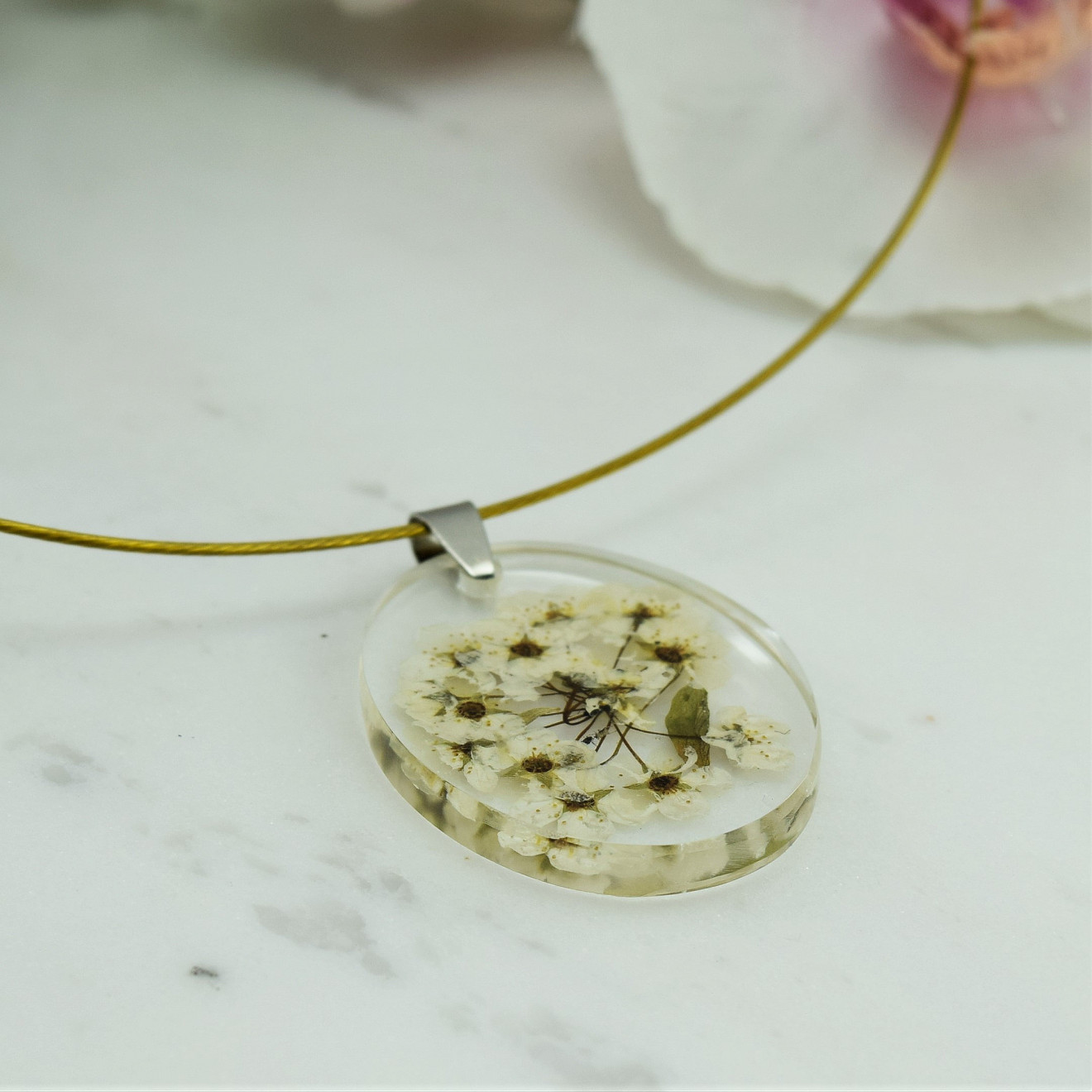 Ръчно направено колие от смола " Бяло Цвете " . Състои се от висулка направена от смола с вградени бели Цветчета ,и стоманен обръч в златисто . Размер на висулката 3,6см/2,8см , дължина на колието 45см