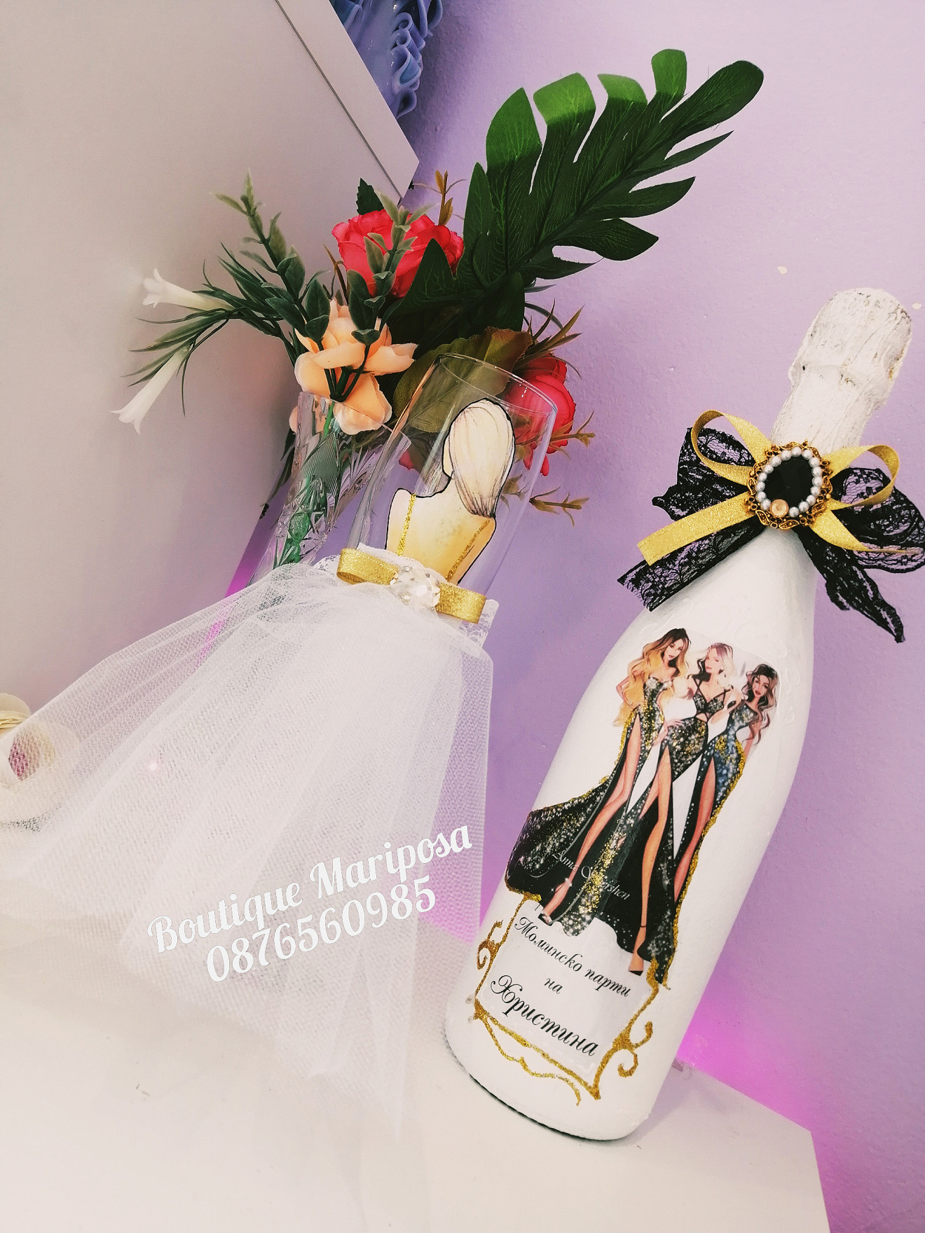 Бутилка шампанско и чаша за булка ръчна изработна. Това е прекрасен подарък за любимата ви бъдеща булка. Цвета и модела са по желание на клиента. Може да разгледате повече на нашата страница или сайт: www.passionis-art.com www.facebook.com/svatbenaagenciqmariposa tel.: 0876560985