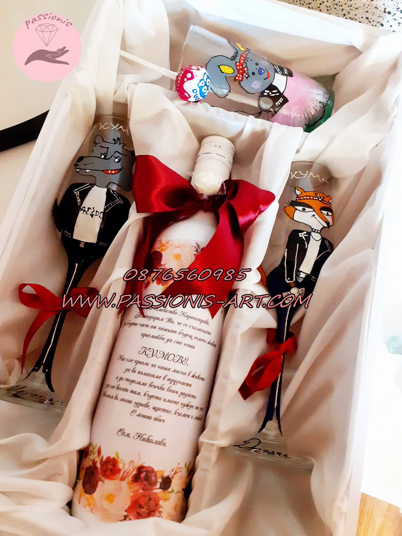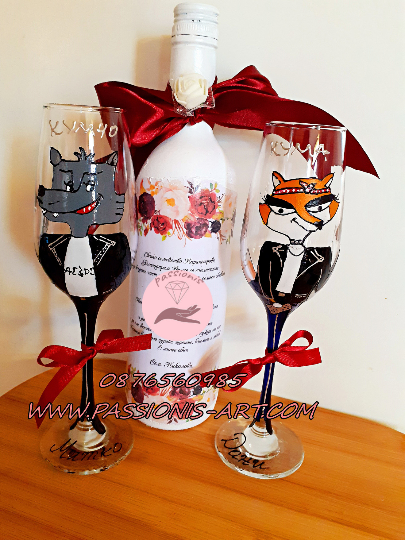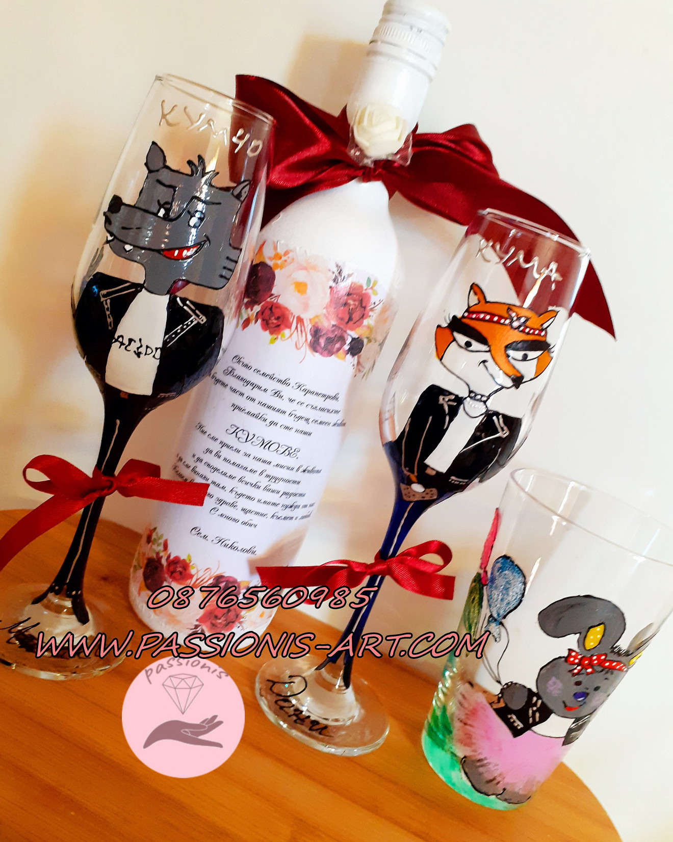 Покана, подарък за кумове Кума и Кумчо в Рок стил + чаша за детето на кумовете. Едно прекрасно предложение за подарък или покана за вашите кумове, а именно комплект рисувани чаши, в този комплект сме включили и чаша за детето на кумовете. Цвета е по желание на клиента. За повече информация и поръчка свържете се с нас на: тел.: 0876560985 www.passionis-art.com www.facebook.com/svatbenaagenciqmariposa