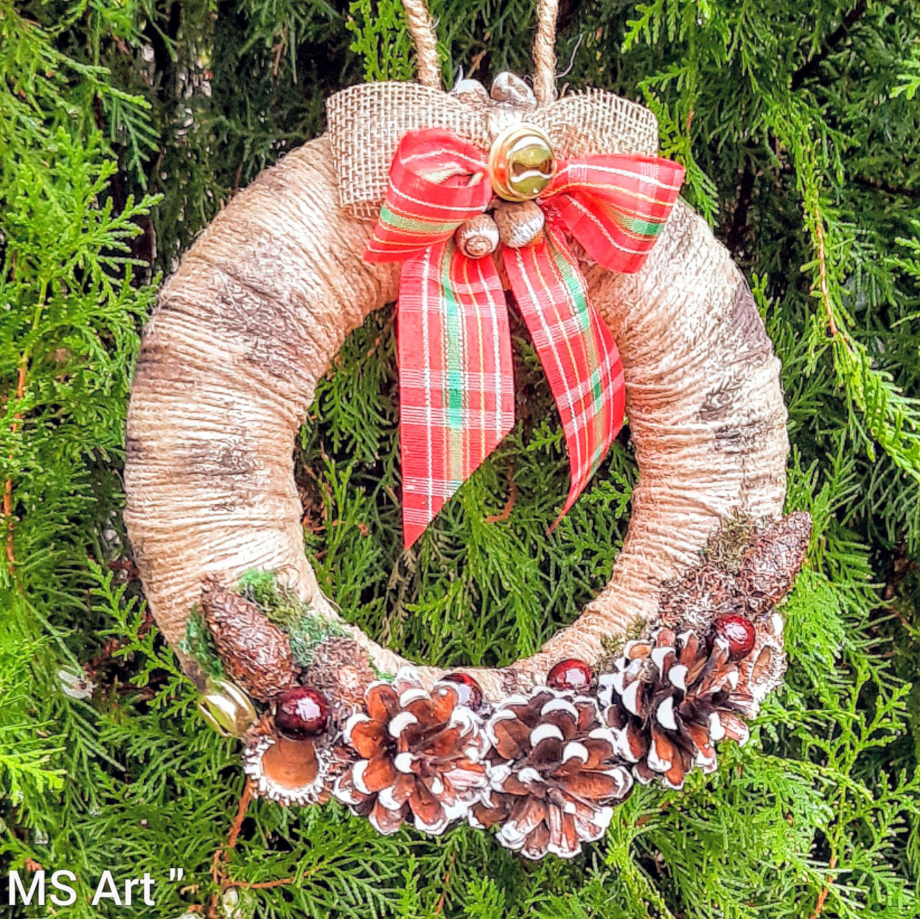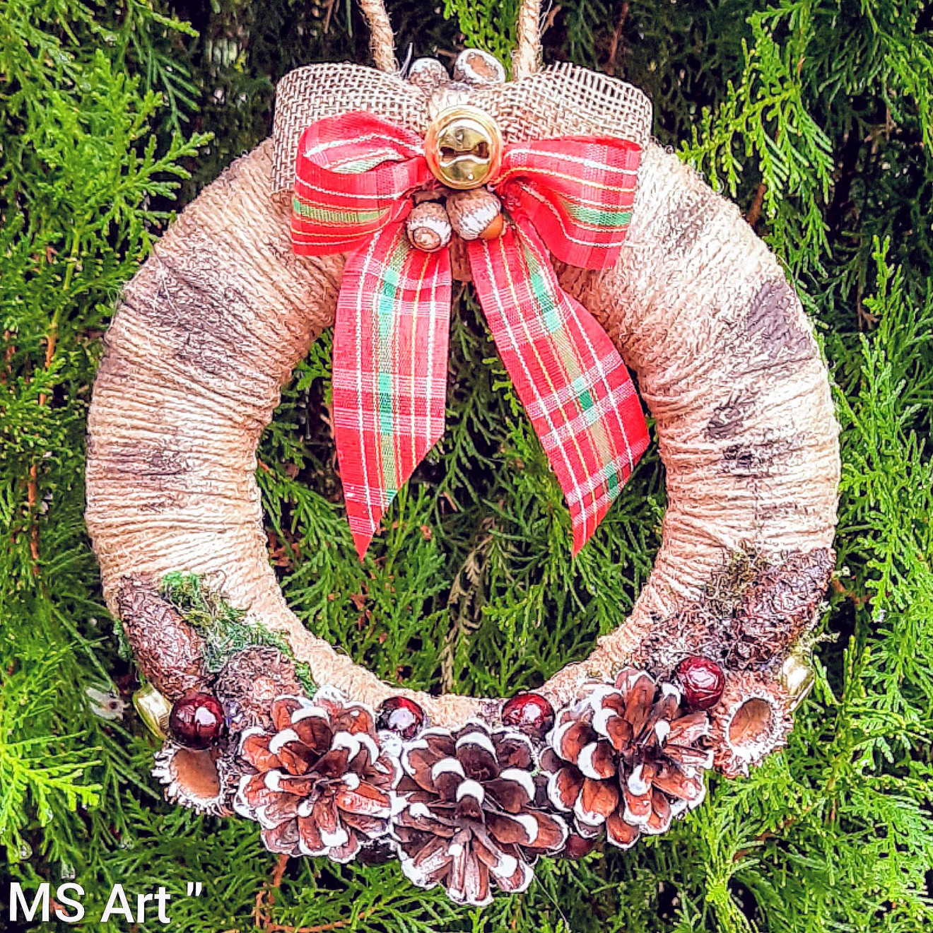#Коледен #венец! #Коледна #украса! Венецът е #ръчно #изработен с #естествени #материали, #канап, #шишарки, #жълъди, #декоративна #трева, дорисуван с #акрилни #бои, #панделка, #звънчета и други, готов за окачване, с основа #стиропор с диаметър 17 см.