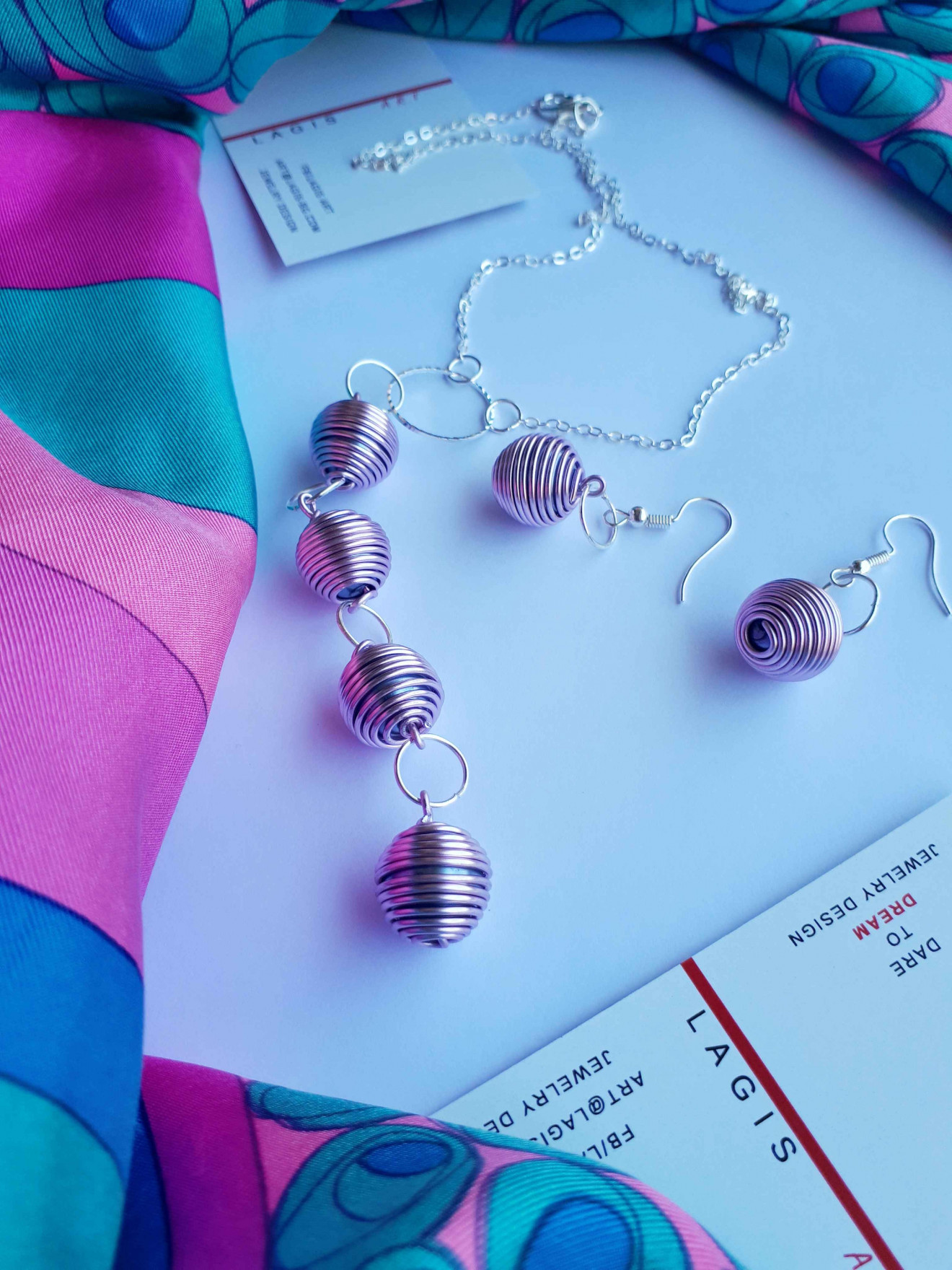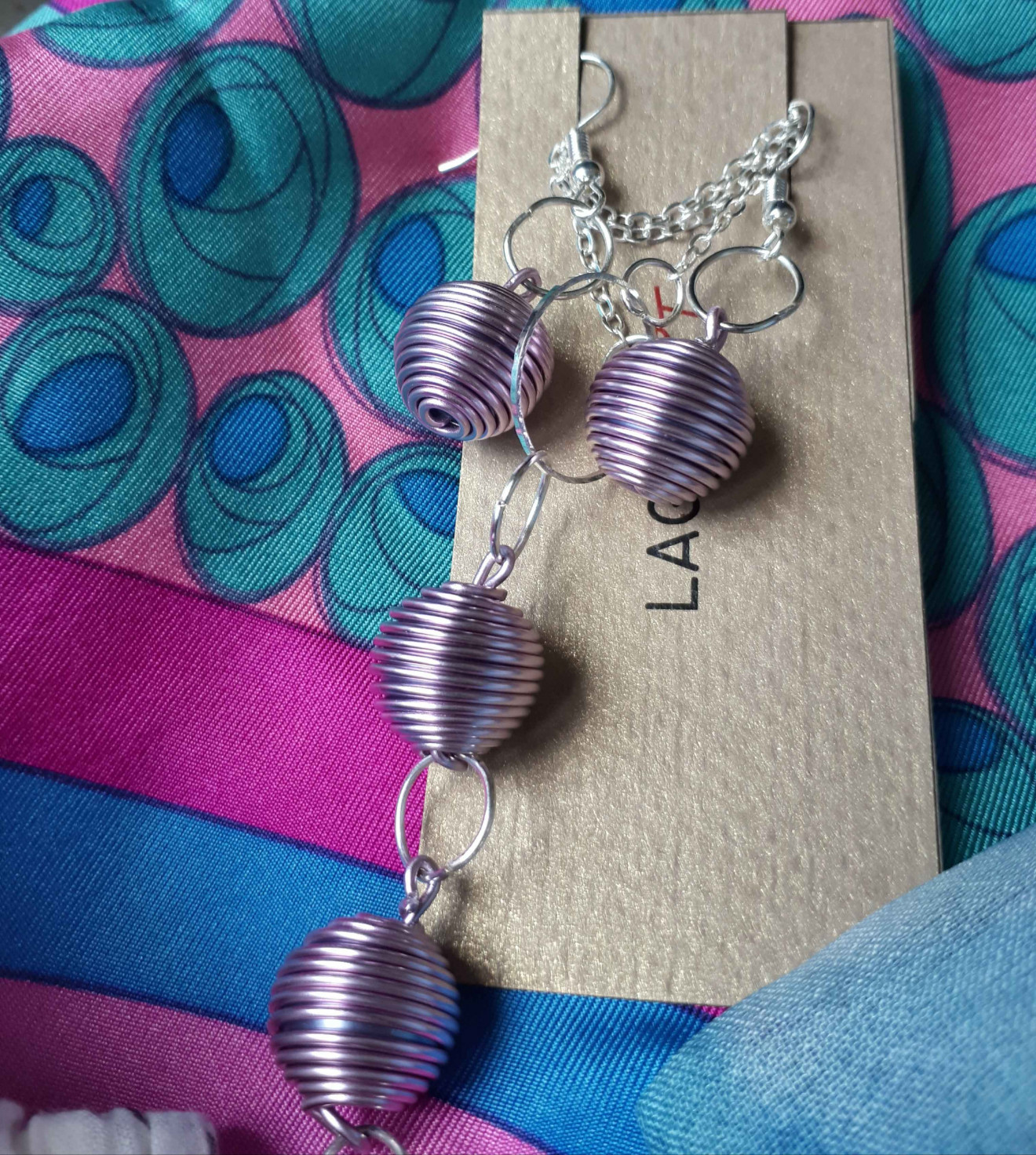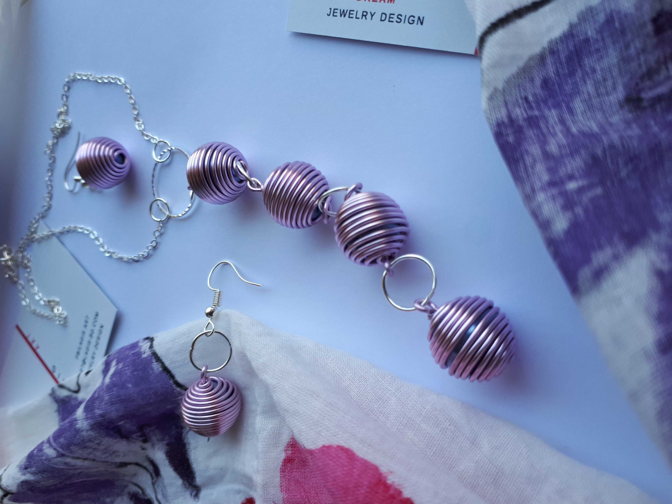 #Комплект#колие#обеци, използвана е анодизирана алуминиева тел- цветна,ръчно увита около цветни стъклени мъниста. Синджирчето, кукичките и другите свързващи елементи са #неръждаема#стомана#