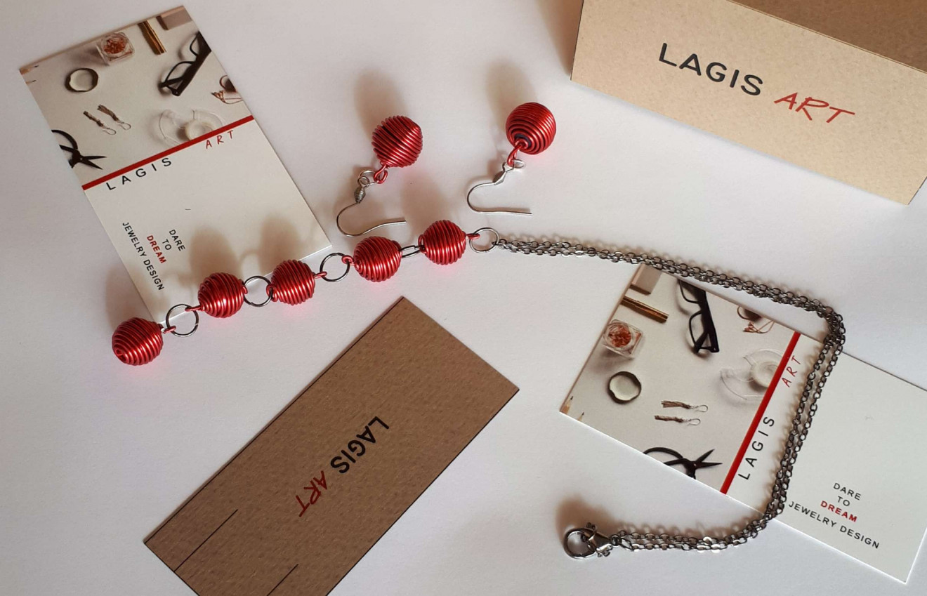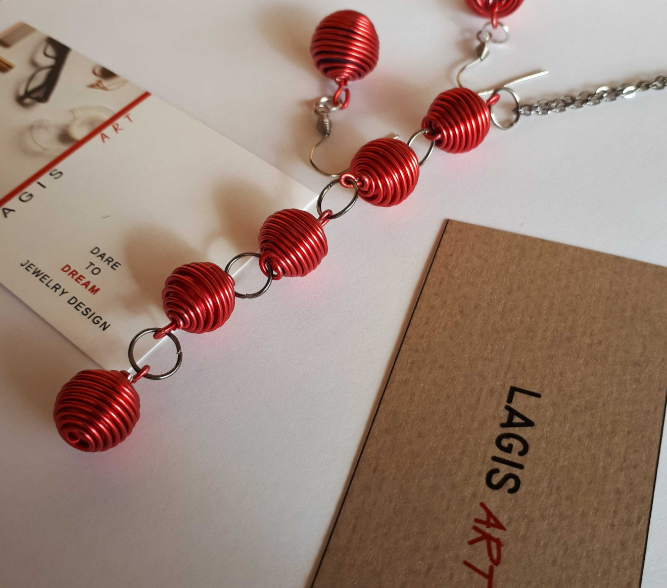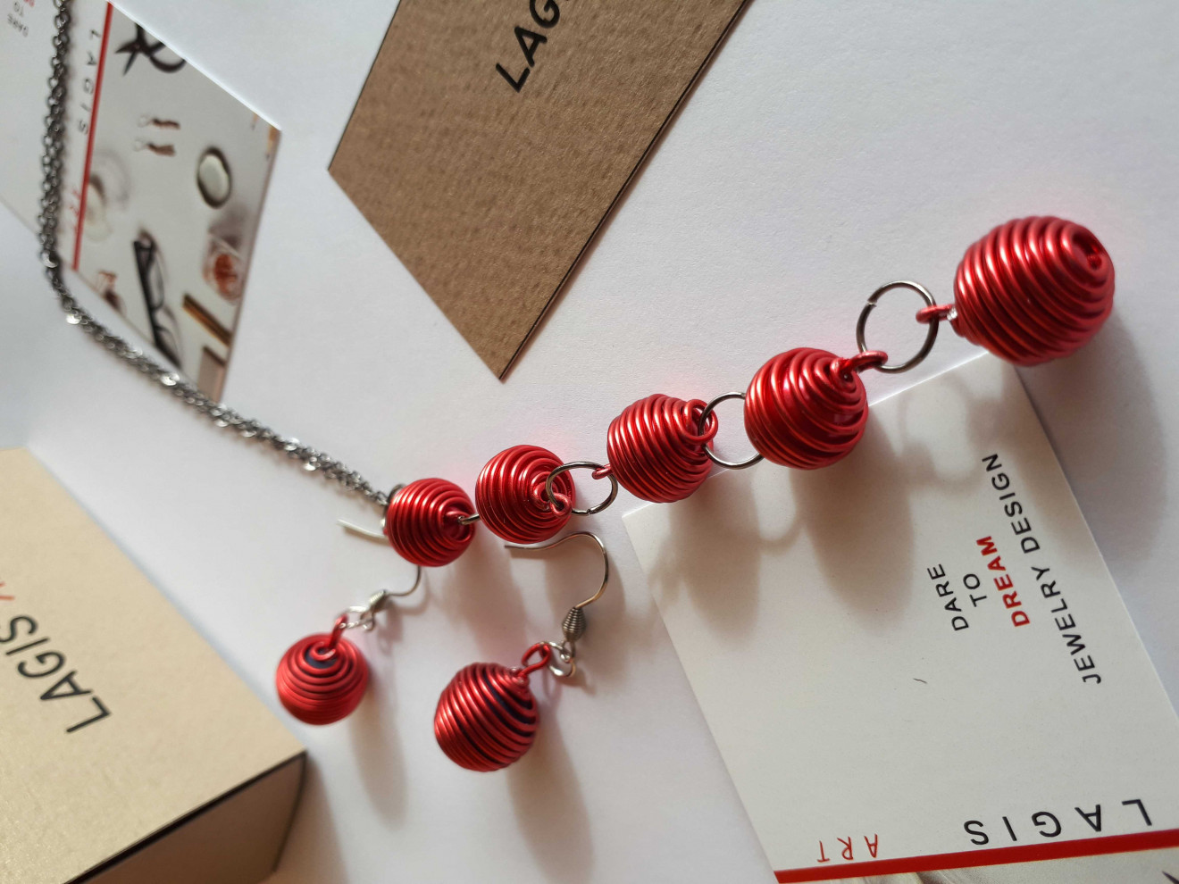 #Комплект#колие#обеци#, използвана е анодизирана алуминиева тел- цветна,ръчно увита около цветни стъклени мъниста. Синджирчето, кукичките и другите свързващи елементи са #неръждаема#стомана#